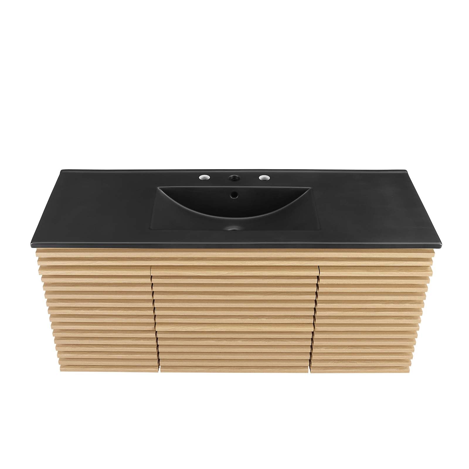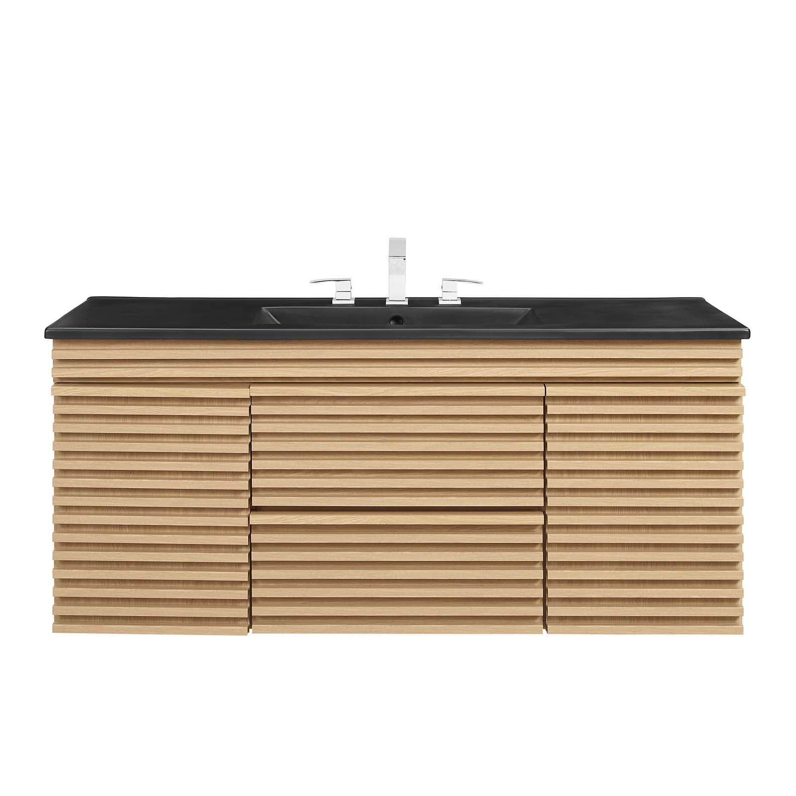 Tap into mid-century aesthetics with the Render Vanity. The Render 48" Single Sink Bathroom Vanity features a durable MDF and particleboard frame with a smooth laminate, ample storage space in two full-extension drawers, adjustable shelves behind soft-close hinged doors, and a space-saving wall-mount design. A curved ceramic basin with an integrated countertop and 8" centerset faucet holes creates sleek lines and a crisp design for an edgy look designed to meet your needs. Boasting a mid-century modern style this vanity features a solid construction with a pleasing look and practical functionality. Assembly required. Fixtures not included. Set Includes: One - 48" Ceramic Basin Top One - 48" Wall-Mount Bathroom Vanity Cabinet