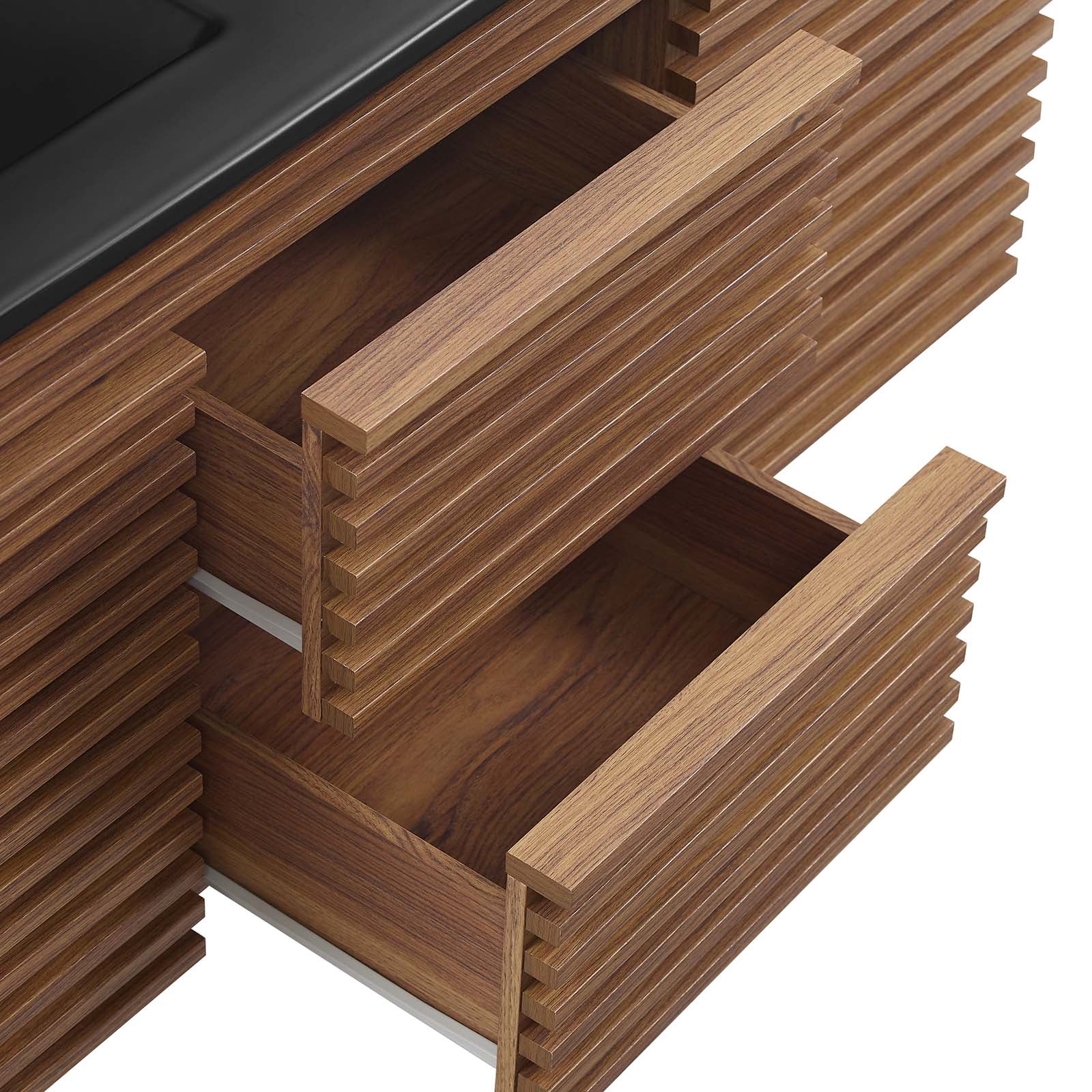 • Bullets: Mid-Century Modern Vanity Wall-Mount Design MDF and Particleboard Full-Extension Drawers Ceramic Sink Basins Fixtures Not Included