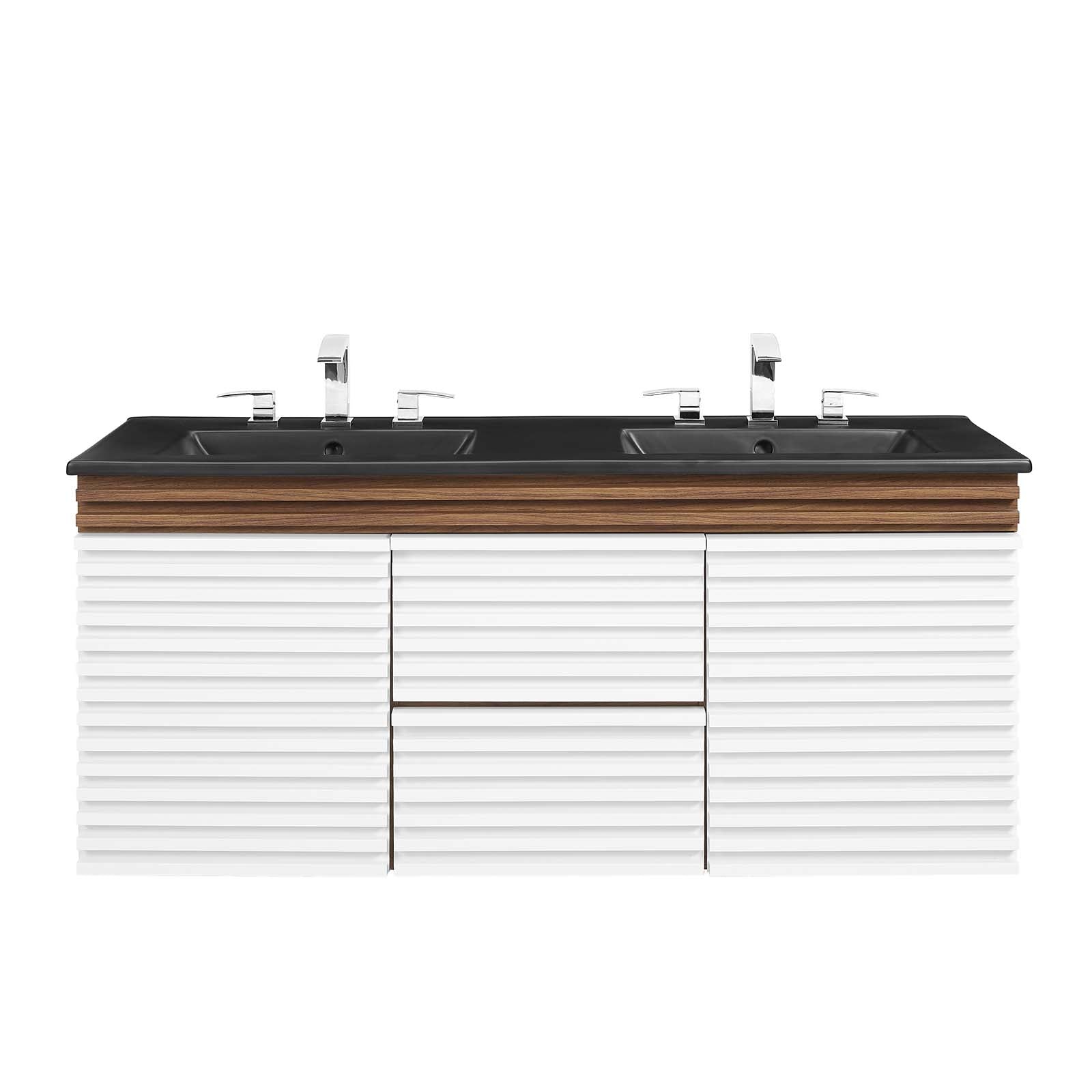 • Bullets: Mid-Century Modern Vanity Wall-Mount Design MDF and Particleboard Full-Extension Drawers Ceramic Sink Basins Fixtures Not Included