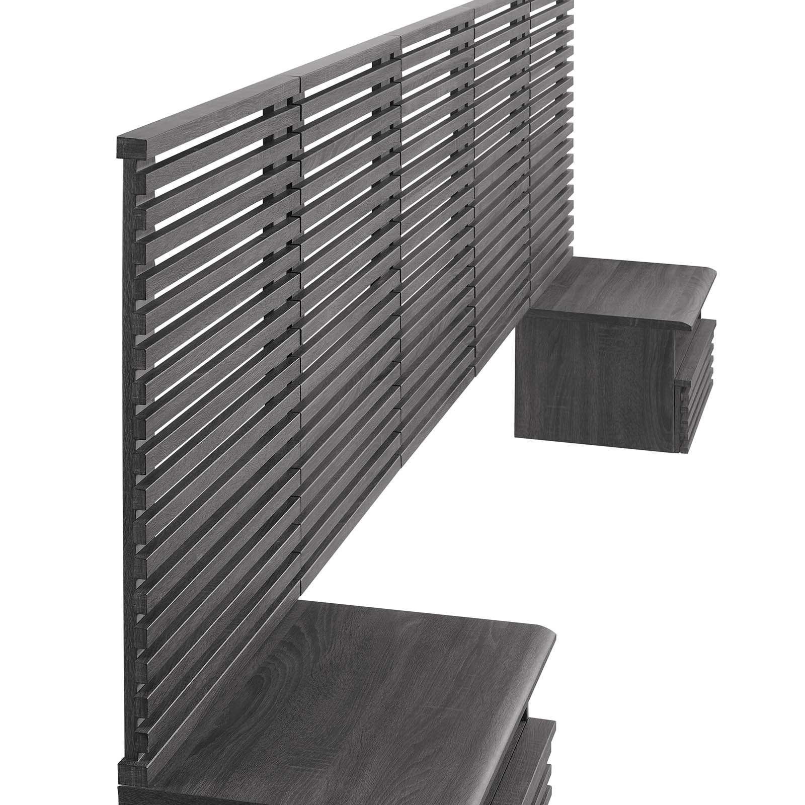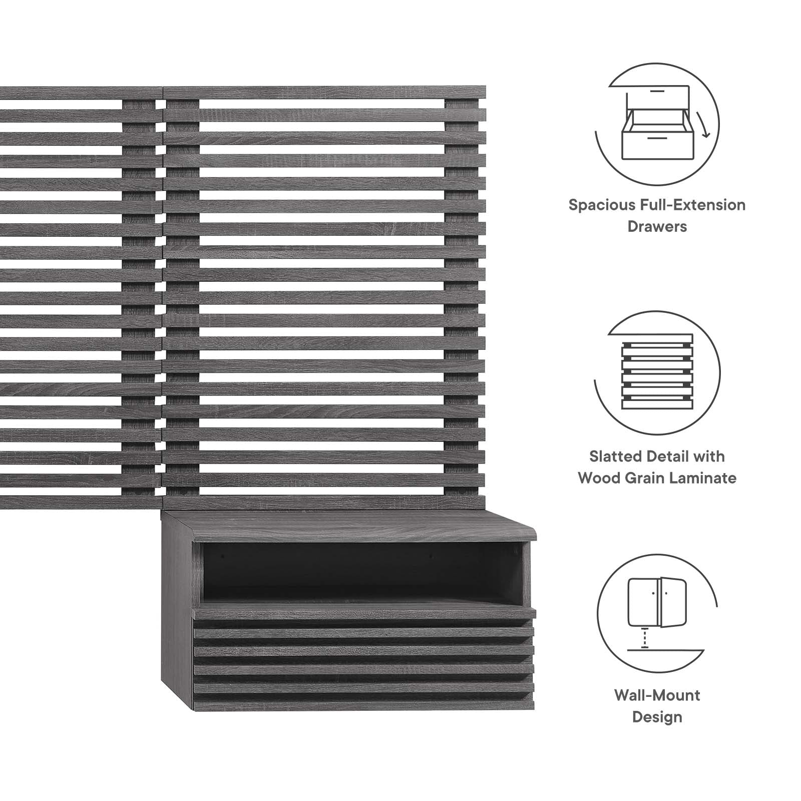 Tap into mid-century aesthetics with the Render Wall-Mount Queen Headboard and Nightstands Set. With slatted detail commanding a presence in a primary bedroom or guest bedroom, this queen size headboard is a collection of panels that feature durable particleboard frames with smooth wood grain laminate. The full-extension glide drawers and open shelves on the nightstands offer ample storage space to keep bedside essentials neat and organized. Both the headboard and the 1-drawer nightstands mount directly to the wall at your desired height to create an eye-catching backdrop in the bedroom. Set Includes: Five - Wall Mounted Headboard Two - Night Stand