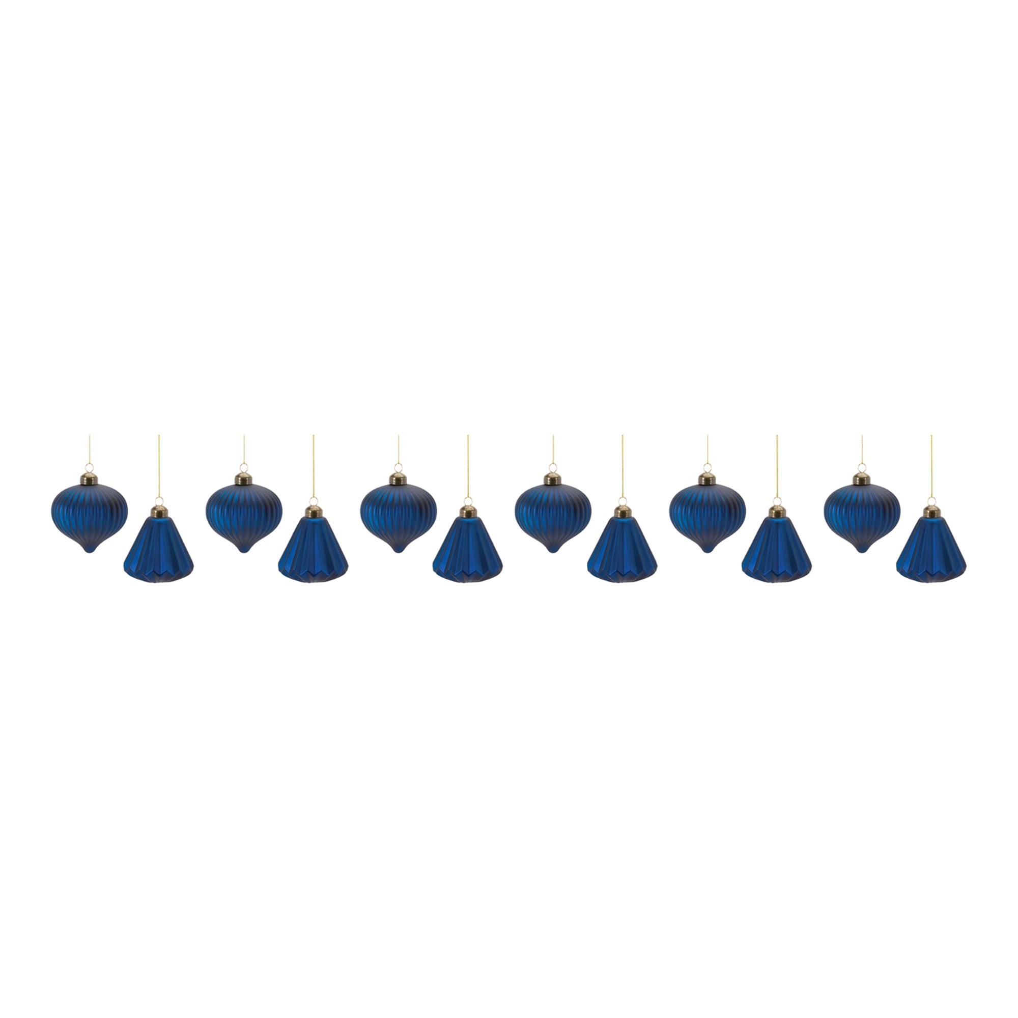 Adorn your Christmas tree and holiday decor with this stunning set of Ribbed Glass Ornaments. Featuring 12 pieces, the wintry blue tones paired with the ribbed design is the perfect combination to create a memorable display. The quality glass composition and delicate gold string hanging accent is sure to endure for seasons to come. Whether you're adding a touch of cheer to your home or gifting to a loved one, these ornaments will definitely bring smiles. , Ornament (Set of 12) 3.5"H Glass