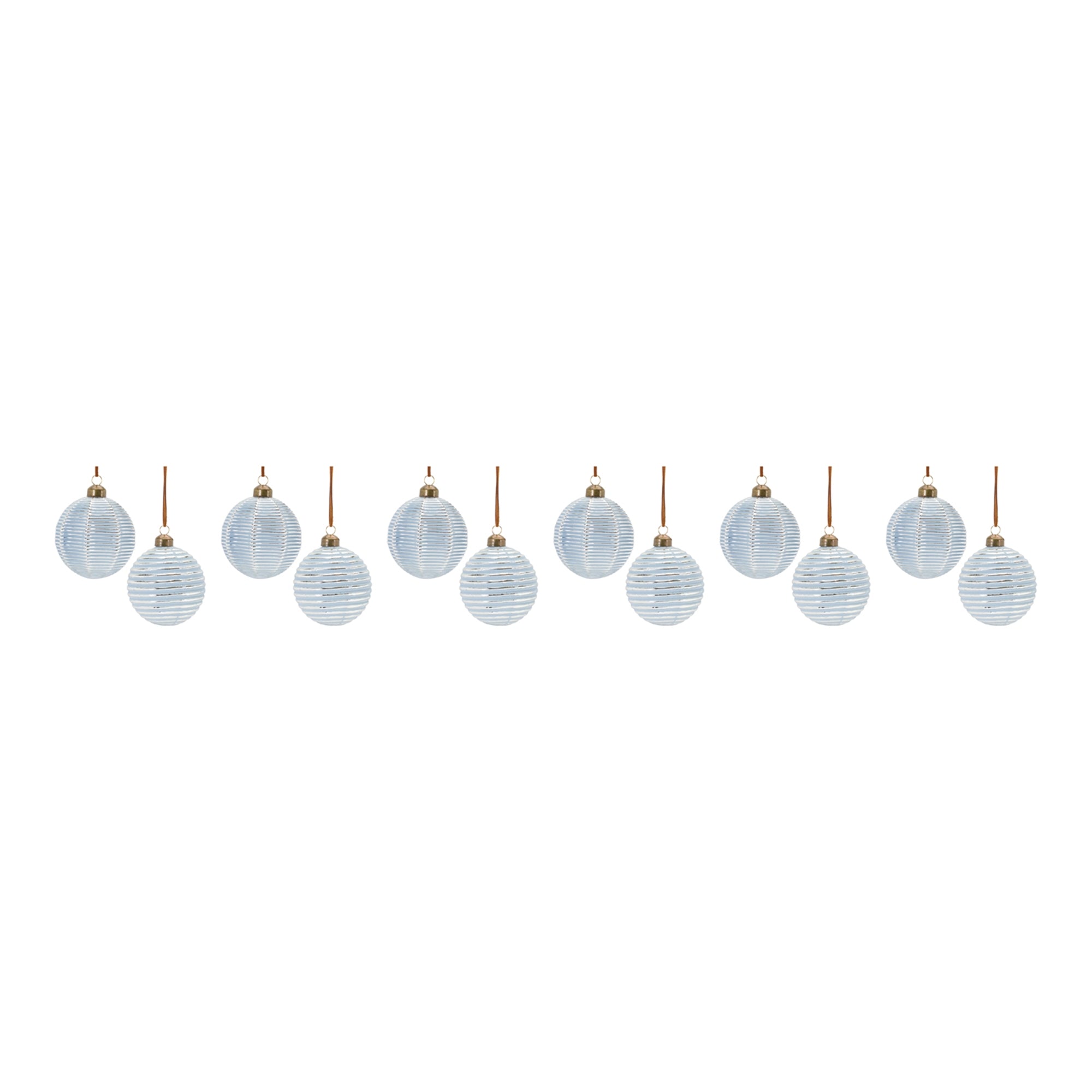 Adorn your Christmas tree and holiday decor with this stunning set of Ribbed Glass Ornaments. Featuring 12 pieces, the wintry blue and white tones paired with the ribbed design is the perfect combination to create a memorable display. The quality glass composition and delicate cord string hanging accent is sure to endure for seasons to come. Whether you're adding a touch of cheer to your home or gifting to a loved one, these ornaments will definitely bring smiles. , Ornament (Set of 12) 3"D Glass