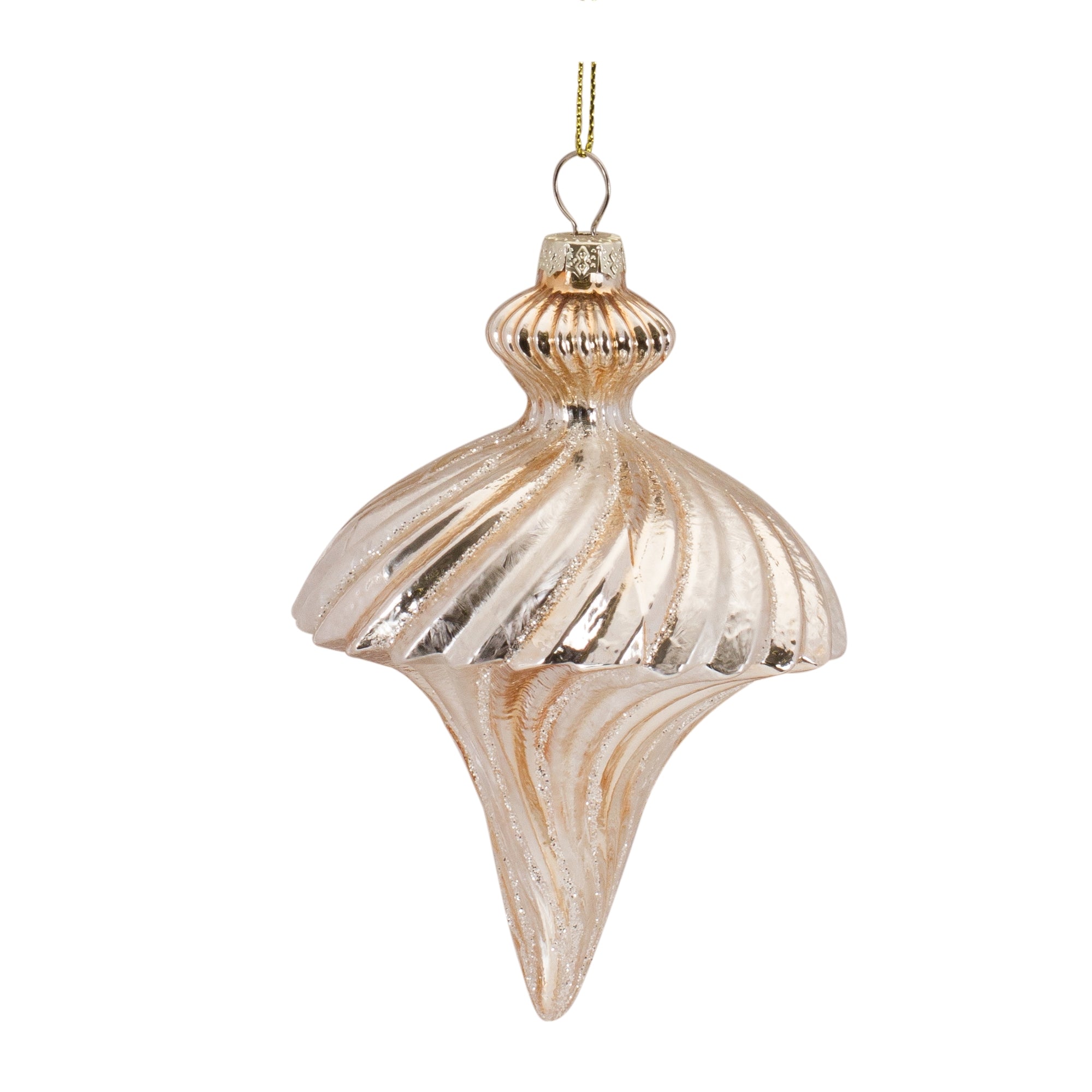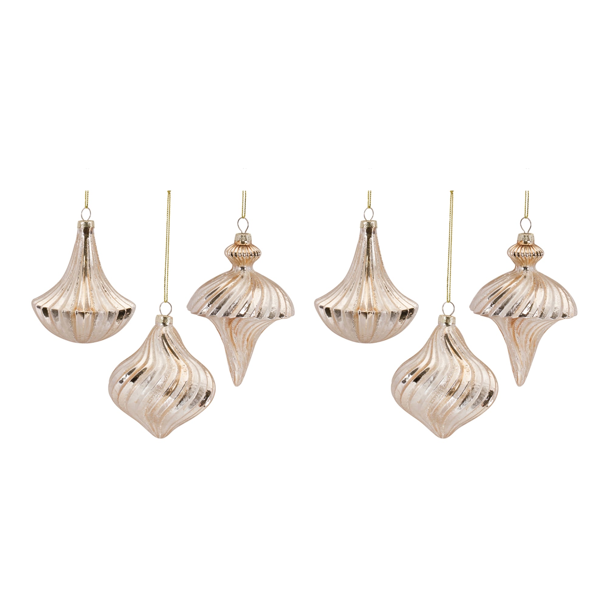 Adorn your Christmas tree and holiday decor with this stunning set of Ribbed Swirl Glass Ornaments. Featuring 6 pieces, the chic silver and gold tones paired with the ribbed design is the perfect combination to create a memorable display. The quality glass composition and delicate gold string hanging accent is sure to endure for seasons to come. Whether you're adding a touch of cheer to your home or gifting to a loved one, these ornaments will definitely bring smiles. , Ornament (Set of 6) 4.5"H Glass