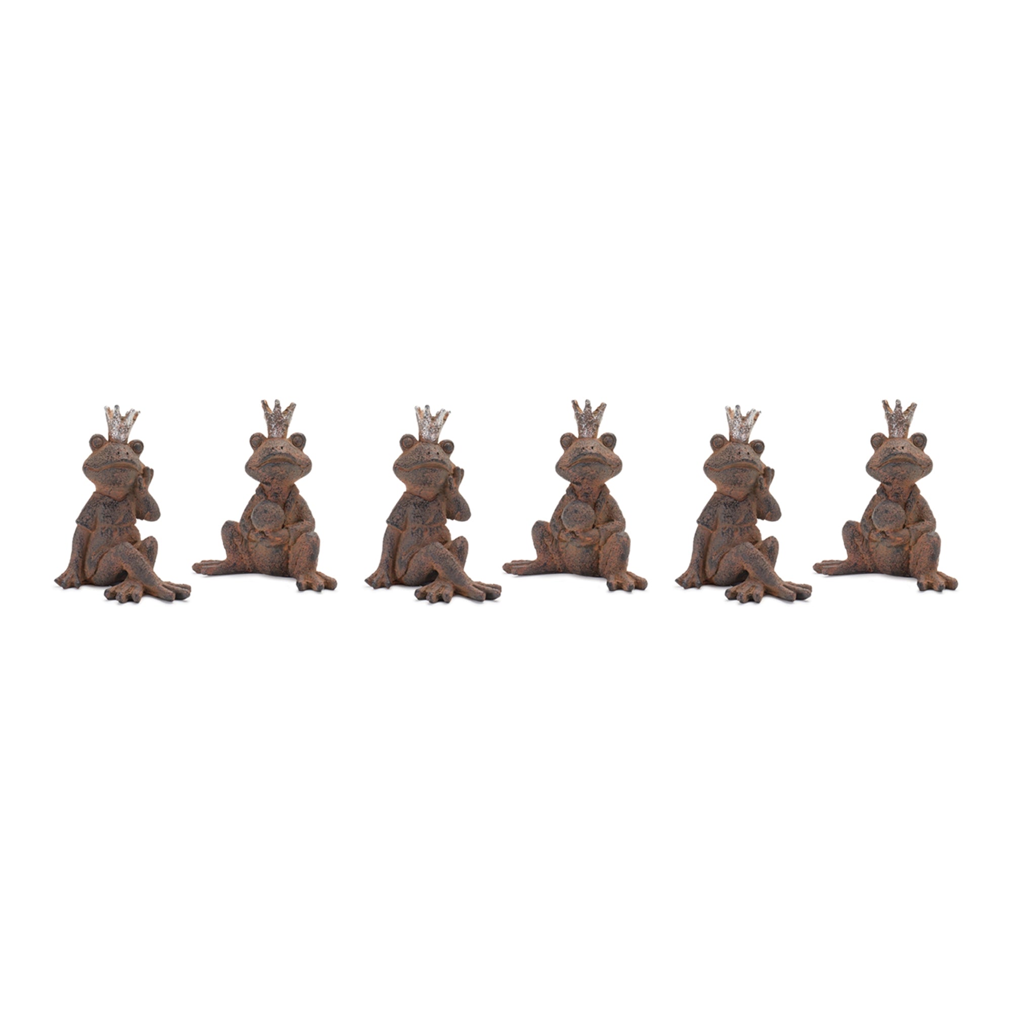 Elevate your outdoor garden space with this elegant set of Royal Frog Figurines! Our whimsical characters are crafted with a rustic metal design, king and queen crown accents, and polyresin construction to bring life to your indoor or outdoor-covered garden decor. Create a unique look that stands out with these charming figurines that are sure to impress your guests!, Royal Frog (Set of 6) 4.5"H Resin