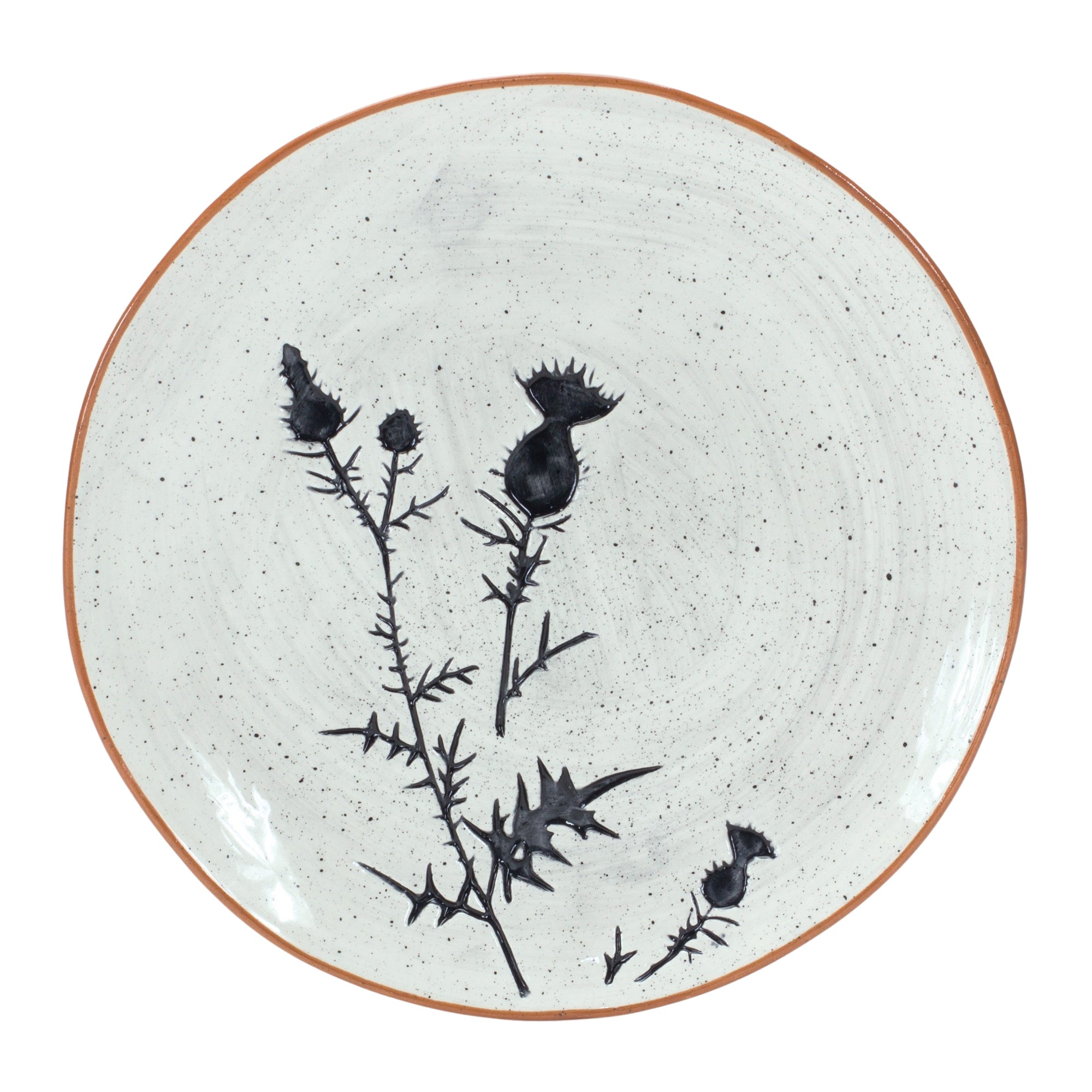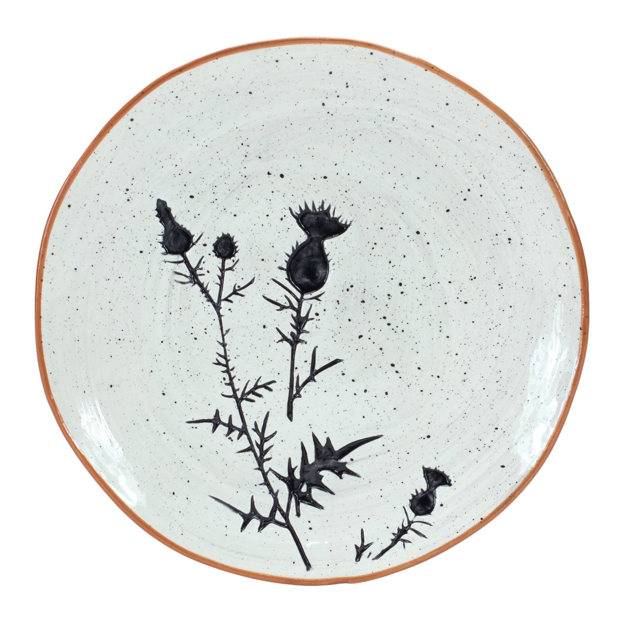 Serve your guests in style with this beautiful set of Ceramic Thistle Plates. Featuring four pieces, this set would be a great addition to your farmhouse or rustic style of decor. The delicate thistle flower paired with the classic black and white finish and speckled accents is the perfect combination to create a stunning display. The quality ceramic composition is sure to last for seasons to come., Plate (Set of 4) 8"D Ceramic
