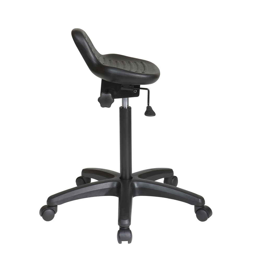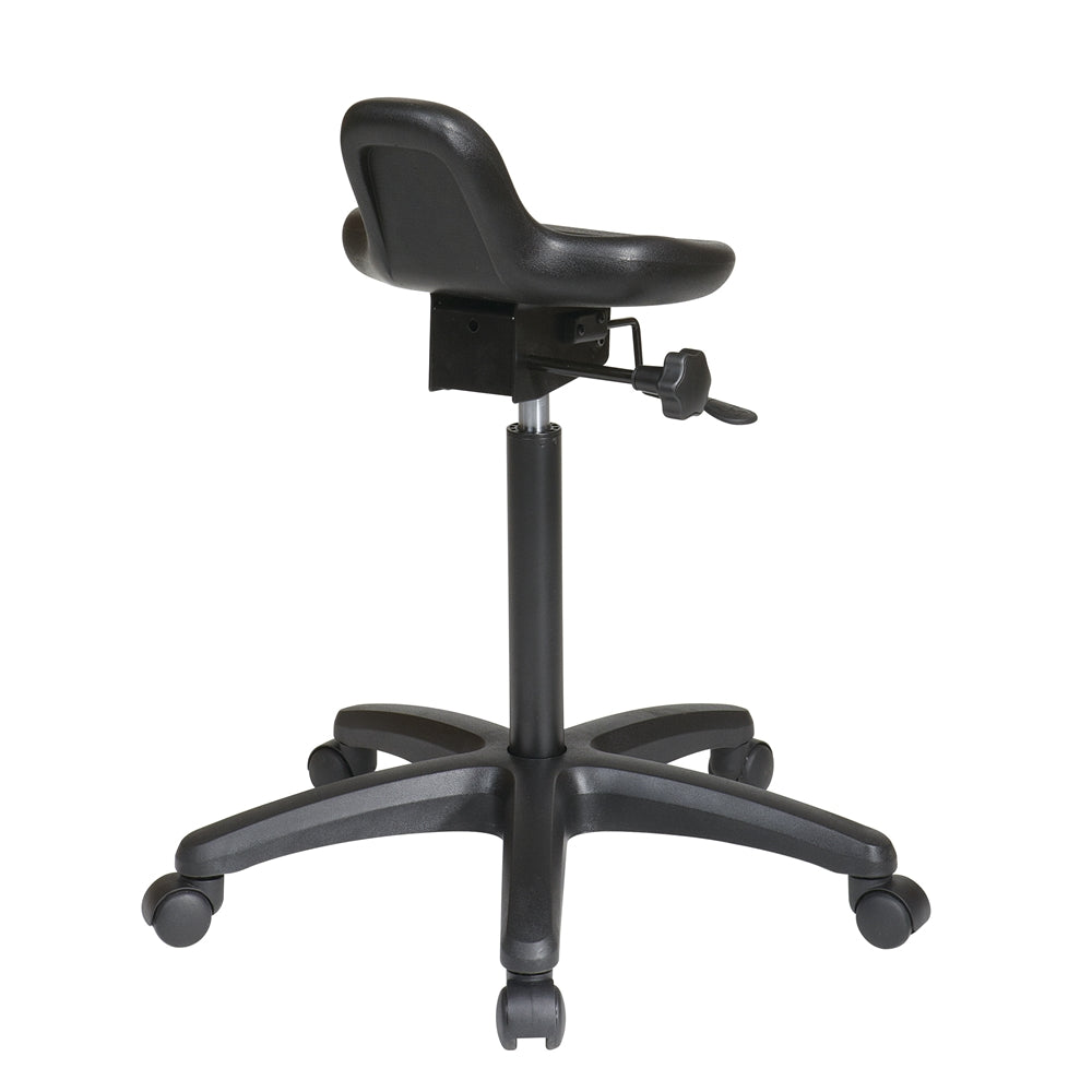Saddle Seat Stool with Seat Angle Adjustment and Glides. Pneumatic Seat Height Adjustment. 360 degree swivel.