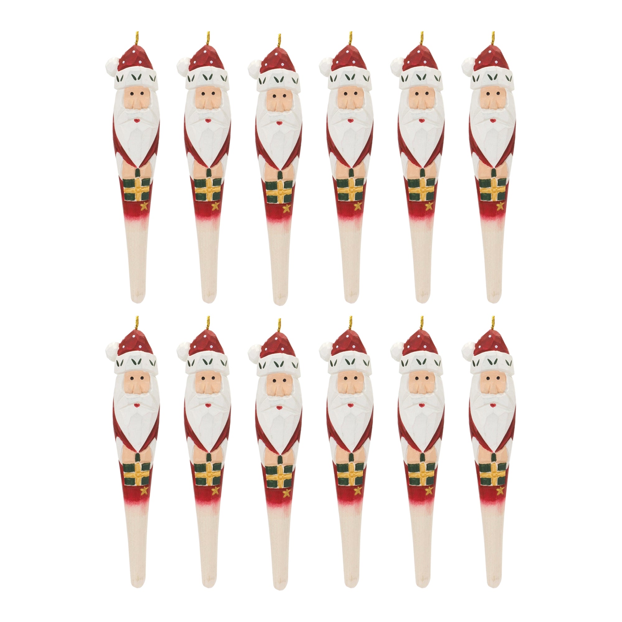 Get into the holiday spirit with this set of Santa Drop Ornaments! Whether you're adding a touch of cheer to your tree or gifting to a loved one, these ornaments will definitely bring smiles to your home. With festive red and white tones, carved design, and a quality solid wood construction, these joyful decorations are sure to last for years to come! Add a little something special this holiday season with this memorable set of ornaments., Santa Drop Ornament (Set of 12) 7.25"H Wood