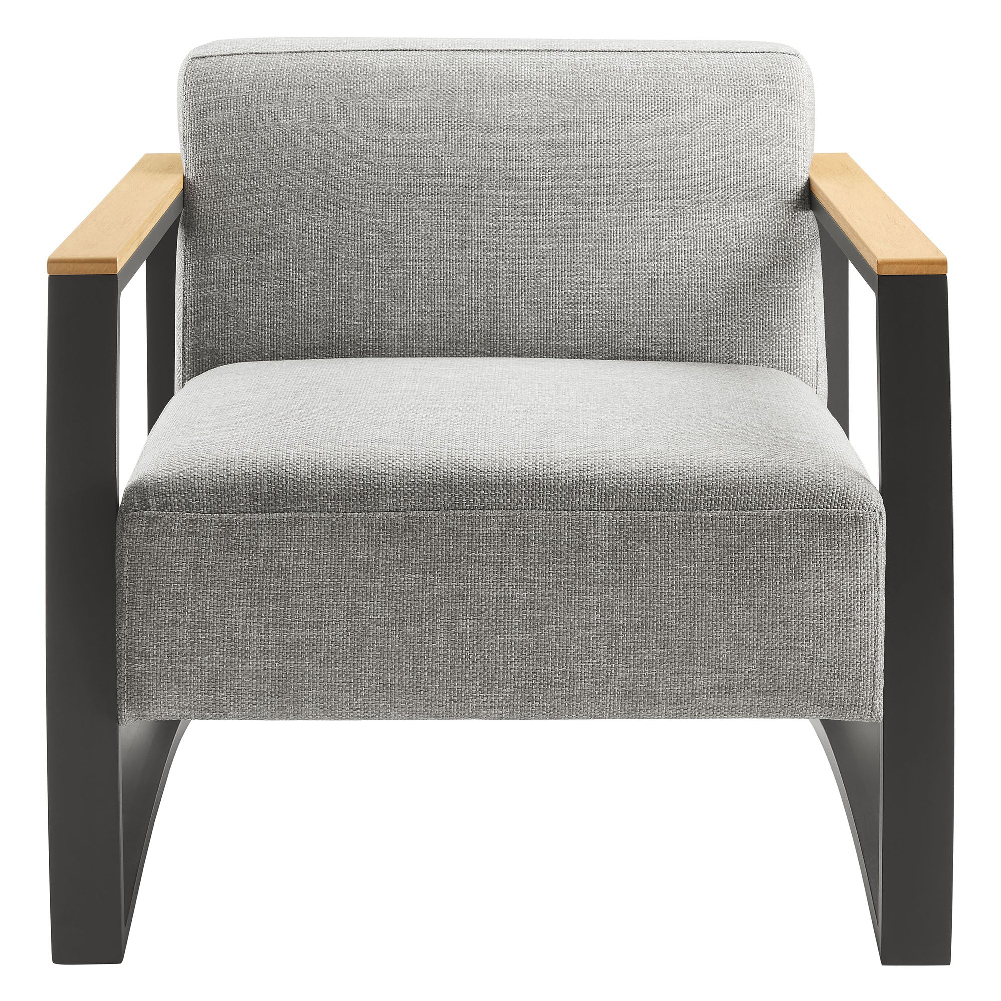 Introduce a touch of refined elegance to your outdoor haven with the Sauve Outdoor Patio Armchair. This modern patio chair features a durable powder-coated aluminum frame that has a unique square shape and curved legs. The distinctive arch of the patio armchairÕs legs adds a dynamic visual appeal that complements modern outdoor areas. With water-resistant fabric upholstery and fixed seat and back cushions filled with dense foam padding, the Sauve Single Patio Chair provides a cozy spot to relax, no matter the weather. This comfortable patio chair is enhanced by armrests finished with stylish plastic wood, combining natural elegance with durable construction, while adjustable foot pins protect floors from scratches and allow for easy movement, highlighting the club chairÕs practicality. Conveniently, the Sauve Aluminum Patio Accent Chair with fabric seats arrives fully assembled, so you can enjoy its comfort and style right out of the box. Weight Capacity: 331 lbs One - Sauve Outdoor Patio Armchair