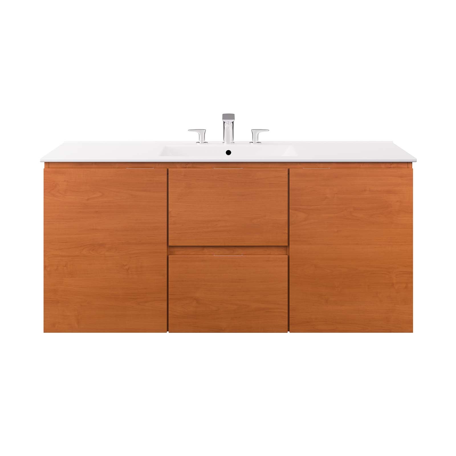 Streamlined design takes center stage in your bathroom with the Scenic 48" Wall-Mount Bathroom Vanity. Boasting clean lines and modern style, this bathroom vanity is crafted with melamine and features a beautiful wood grain finish that incorporates natural aesthetics. This vanity is a complete addition to the bathroom with a ceramic sink basin with an integrated countertop and 8" centerset holes. Mounting directly to the wall with a drywall-friendly metal cleat, this vanity cabinet offers ample storage space for bathroom essentials in two full-extension center drawers and height adjustable shelves behind soft-close doors. Fixtures not included. Assembly required. Set Includes: One - Scenic 48" Wall-Mount Bathroom Vanity