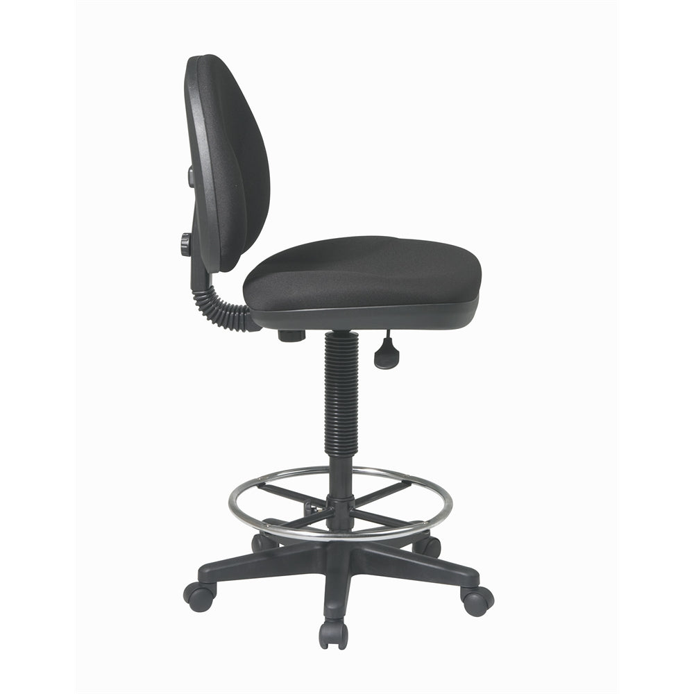 Sculptured Seat and Back Drafting Chair with Adjustable Foot ring. Pneumatic Height Adjustment 24" to 34" overall. Heavy Duty Nylon Base with Dual Wheel Carpet Casters