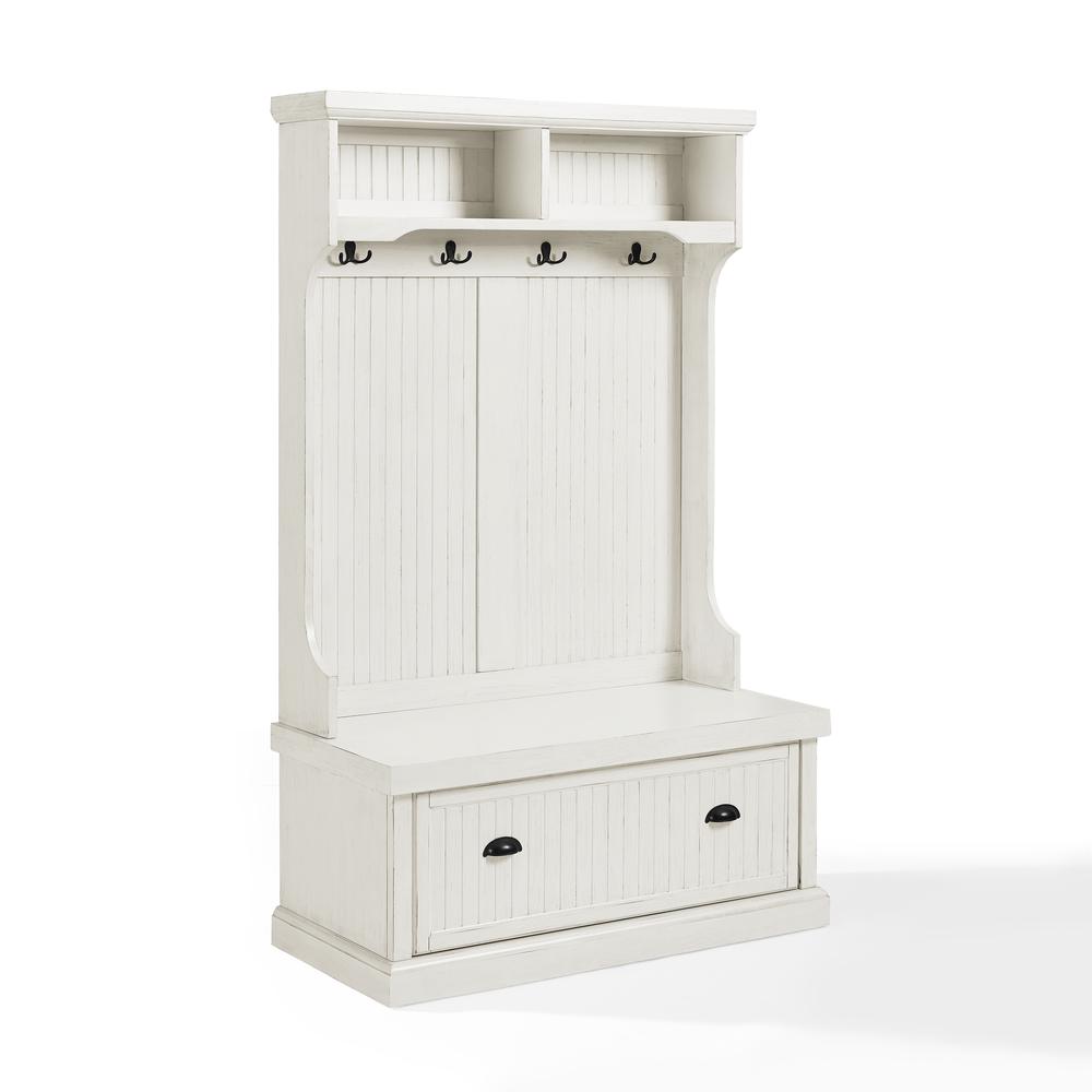 Add coastal flair to your mudroom with the Seaside Hall Tree. This full-size entryway bench with coat rack offers both seating and shoe storage in an elegant package. The lower shoe bench offers two large cubbies behind a pull-down door, perfect for use as a shoe rack. Two overhead storage shelves organize smaller items, while four double-prong hooks provide a coat hanger or hat rack stand. Beautifully crafted with beadboard accents and high-end distressing, the Seaside Hall Tree will elevate your home organization.