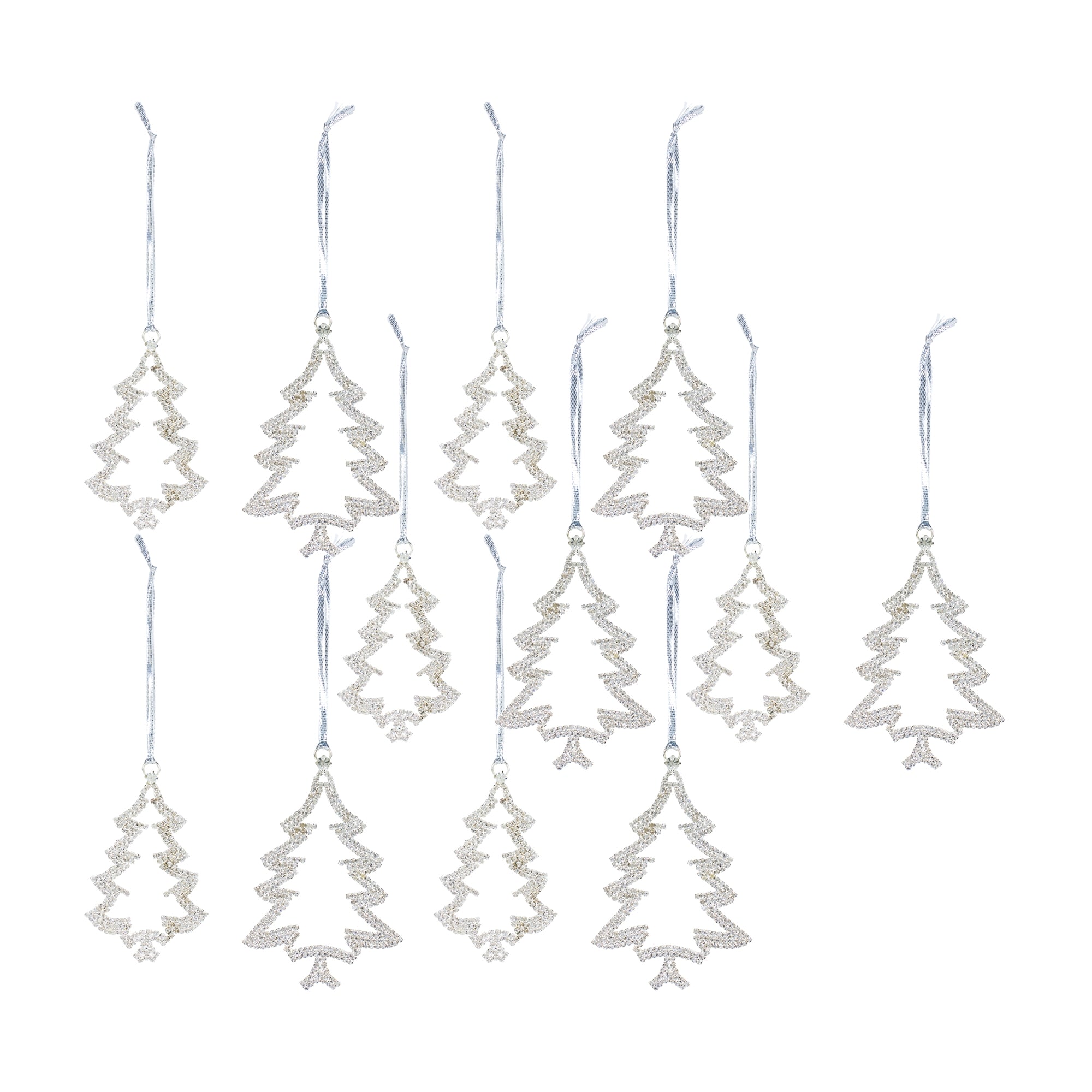 Adorn your Christmas Tree with this beautiful set of Metal Tree Ornaments. The tree outline design paired with the chic silver finish with glass bead accents makes this set the perfect addition to your holiday tree decor. The quality iron metal composition is sure to last for seasons to come. The pieces can be used as gifts for friends to cherish, or you can display the set on your own Christmas tree and enjoy them for years to come., Tree Ornament (Set of 12) 3.75"H, 4.75"H Iron/Glass