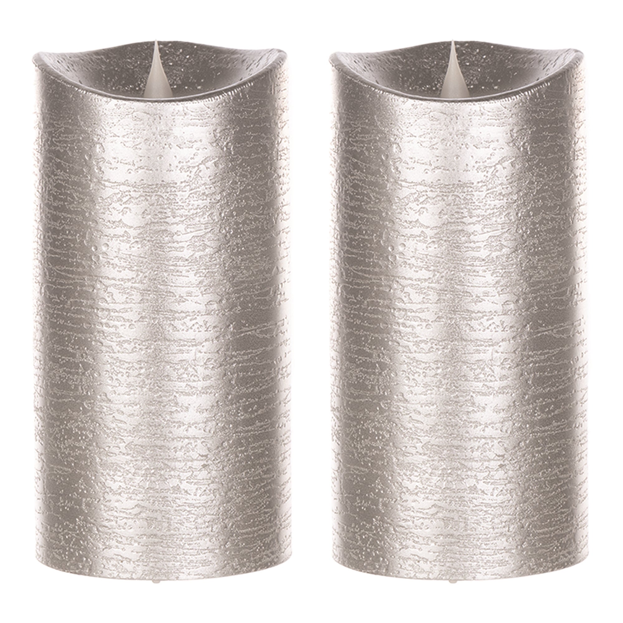 Illuminate your home with this stunning set of Simplux Designer LED Candles. Featuring an traditional pillar shape, chic metallic silver finish, and moving flame accent, this set is a great fit for your contemporary or mid-century modern style of home dŽcor. The set is perfectly crafted with wax and plastic to give it a realistic look. Display the set in a pair of lanterns or candle holders to complete the look., Simplux LED Designer Candle w/4 and 8 Hr Timer (Set of 2) 3.5" x 7.5"H Wax/Plastic (Requires 2 C Batteries, Not Included)