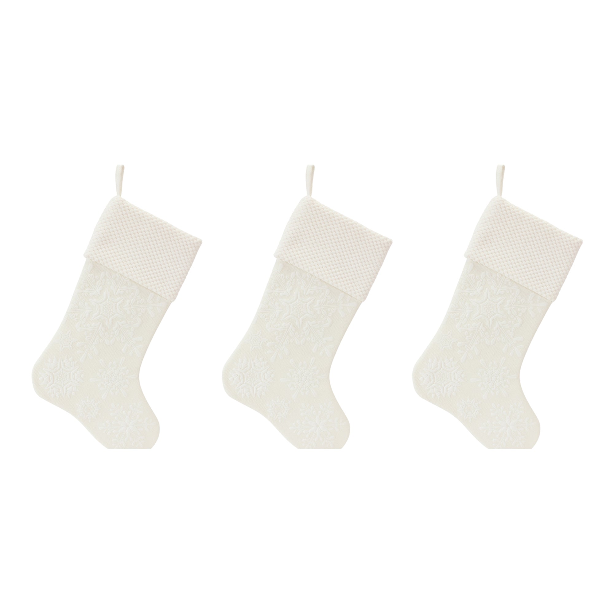 Upgrade your holiday decor with this beautiful set of Snowflake Stockings! Our traditional snowflake design and wintry white tone make a perfect addition to your mantle. It's made with soft polyester for a warm, inviting touch and is sure to bring a holiday cheer to any room. Stop searching for the perfect stocking-- Snowflake Stockings are here!, Stocking (Set of 3) 18"H Polyester