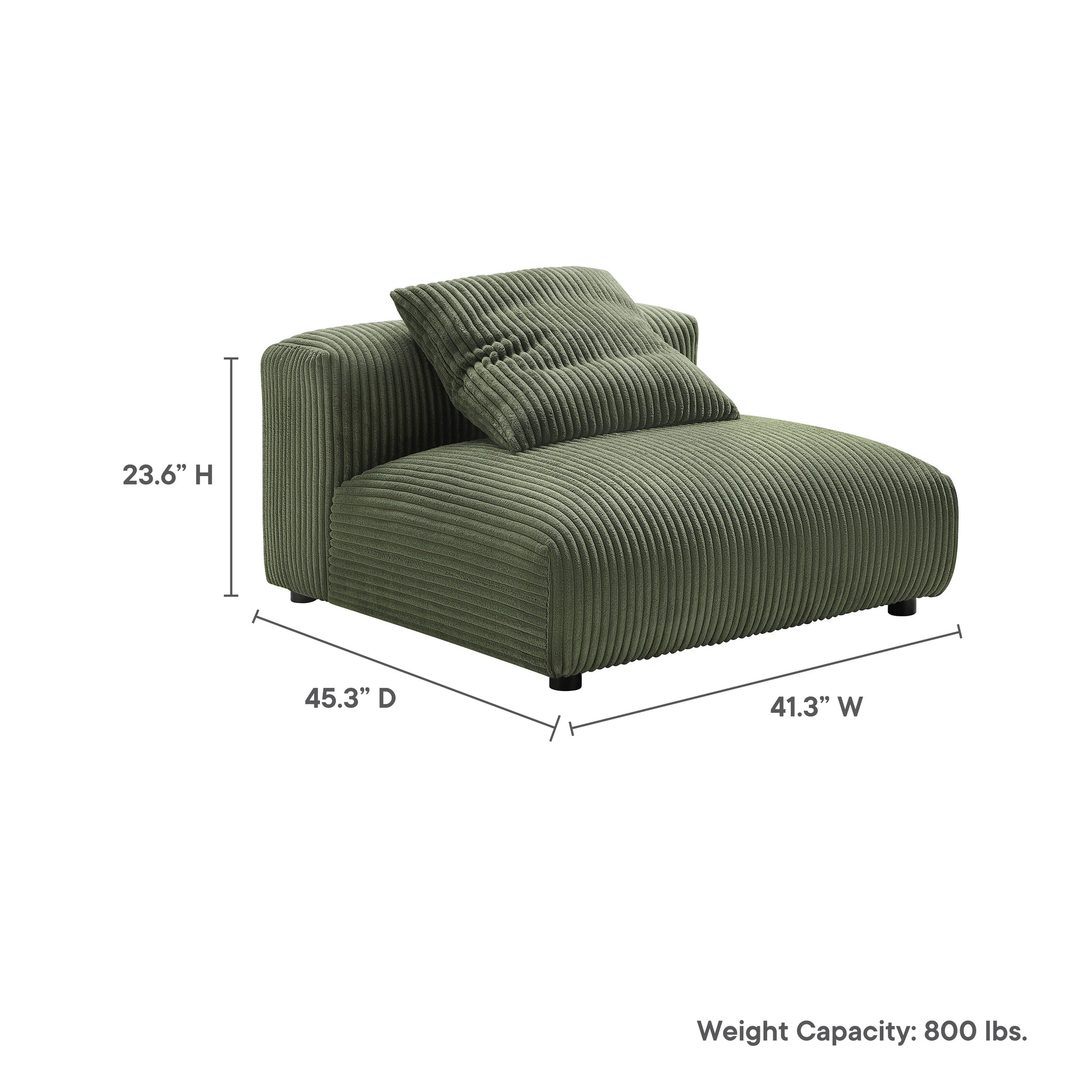 Revel in ultimate comfort and modern style with the Solace Modular Sofa Armless Chair. This oversized corduroy lounge chair is perfect as a single sofa chair or as part of a sectional, offering endless flexibility. Its modular furniture design allows you to change the arrangement to suit the needs of the moment or expand your seating by adding more pieces in the future. Featuring a sturdy frame, dense foam padding, and a sinuous spring support system, the Solace Lounge Sofa Chair grants a premium seating experience. The comfy corduroy upholstery adds a cozy, casual vibe, making this armless accent chair a perfect addition to any living space or lounge area. Equipped with non-marking plastic glides and a complementing accent pillow, this modular chair is both stylish and practical. With easy assembly required, you can enjoy immediate relaxation in this comfy lounge chair. Weight Capacity: 800 lbs. One - Solace Modular Corduroy Upholstered Armless Chair