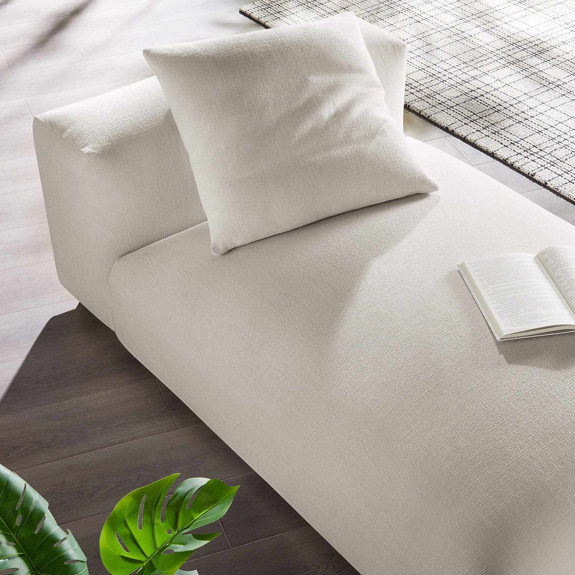 Revel in ultimate comfort and modern style with the Solace Modular Chaise Lounge Chair. This oversized chaise lounge is perfect for any living room or bedroom, offering endless flexibility. Its modular furniture design allows you to change the arrangement to suit the needs of the moment or expand your seating by adding more pieces in the future. Featuring a sturdy frame, dense foam padding, and a sinuous spring support system, the Solace Chaise Lounger grants a premium seating experience with it's soft textured woven fabric upholstery. The comfy upholstery adds a cozy, casual vibe, making this sofa chaise a perfect addition to any living space or lounge area. Equipped with non-marking plastic glides and a complementing accent pillow, this armless chaise lounge chair is both stylish and practical. With easy assembly required, you can enjoy immediate relaxation on this indoor chaise lounge. Weight Capacity: 500 lbs. One - Solace Modular Upholstered Fabric Armless Chaise Lounge