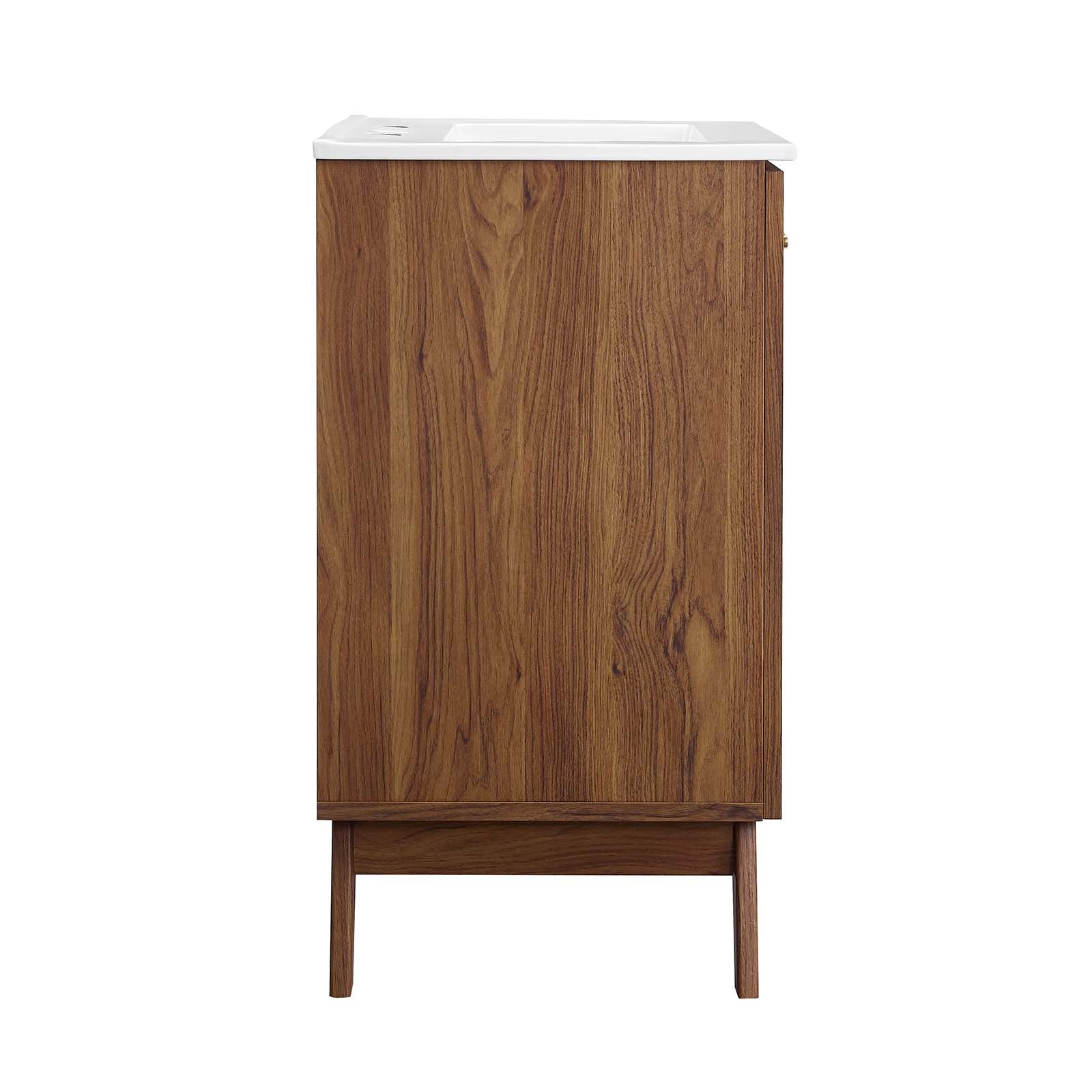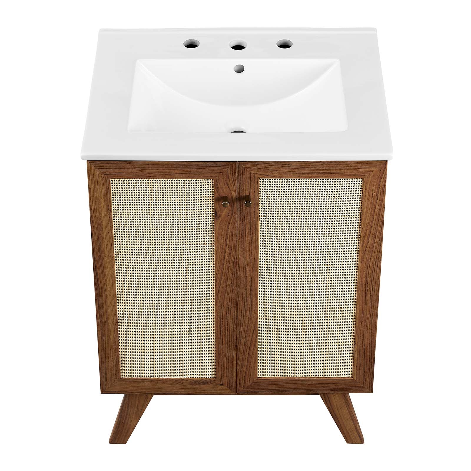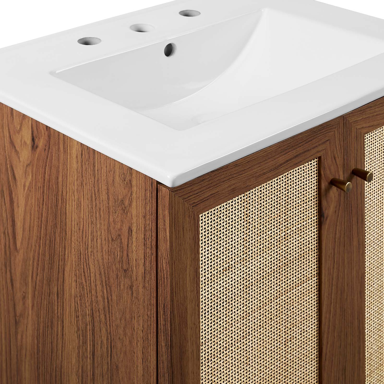 Introduce refreshing style to your restroom with the Soma 24Ó Bathroom Vanity. Showcasing a beautiful rattan weave on the cupboard doors, this vanity brings organic aesthetics and modern functionality to any bathroom or powder room. Crafted from durable MDF and particleboard with a natural wood grain finish, this vanity boasts a ceramic sink basin with 8-inch centerset holes and an integrated countertop. This vanity features an adjustable shelf, providing easy customization for arranging towels, toiletries, and bathroom necessities. Complete with metal doorknobs with a brushed gold finish and soft-close hinges, this bathroom vanity cabinet is designed for quiet and effortless functionality. Resting on splayed legs, the Soma Bathroom Vanity includes non-marking foot caps to protect flooring. Assembly required. Fixtures not included. Set Includes: One - Cayman 24" Bathroom Sink One - Soma 24Ó Bathroom Vanity Cabinet (Sink Basin Not Included)