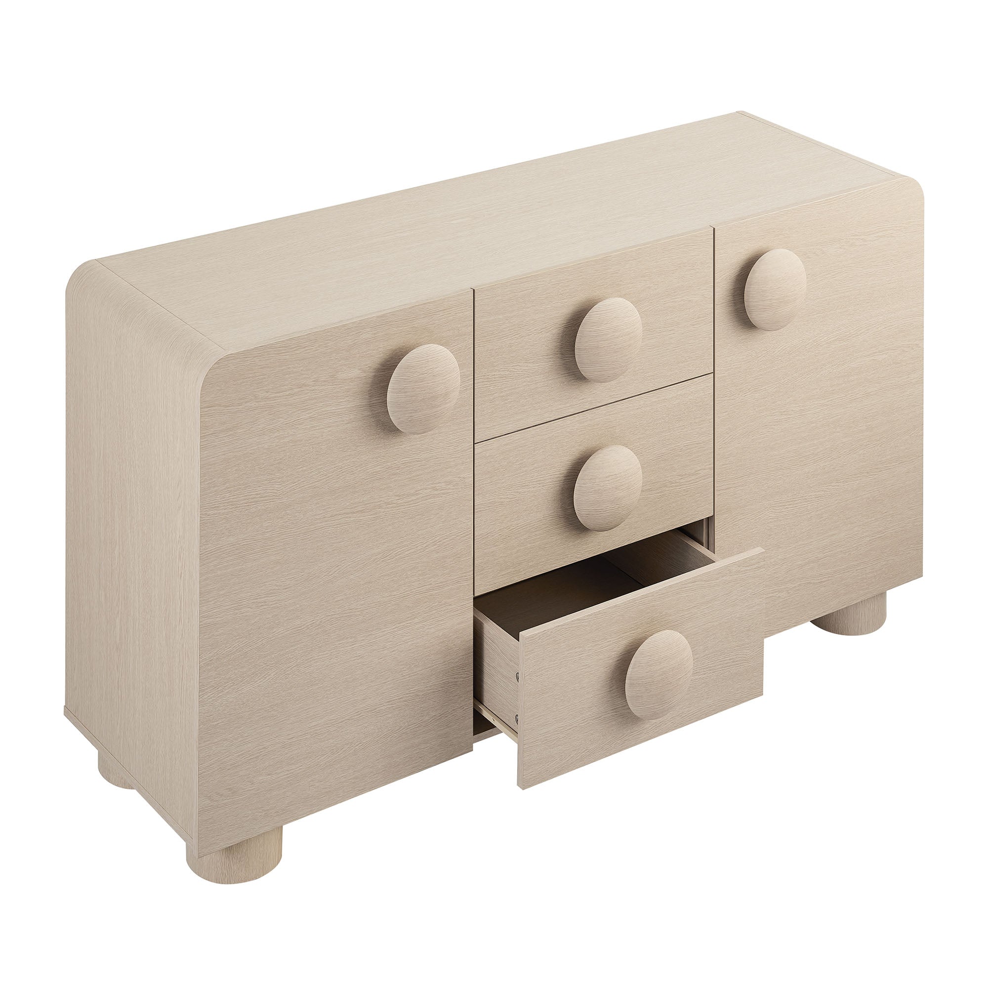Experience the timeless appeal of the Sonnet Retro Curved Sideboard that combines modern design with practical functionality. This 57" sideboard features rounded corners and circular handle pulls that resemble giant buttons, adding a whimsical touch to its sleek aesthetic. Constructed with a durable blend of materials and finished with a wood grain paper laminate, this credenza cabinet is both stylish and sturdy. A perfect sideboard storage cabinet, Sonnet boasts two soft-close hinged doors that open to reveal spacious concealed storage areas with adjustable shelves, ideal for dinnerware, vases, home decor, media essentials, and more. The three center drawers on this modern sideboard grant more storage space and include a safety feature to prevent them from extending fully, enhancing stability and preventing tipping. Versatile in use, Sonnet can also serve as a high TV stand for wall-mounted TVs up to 64 inches, making it an ideal media console for your living room, office, or entertainment space. Resting on simple legs with non-marking foot glides, this sideboard with 3 drawers requires assembly. One - Sonnet 57" Sideboard Storage Cabinet