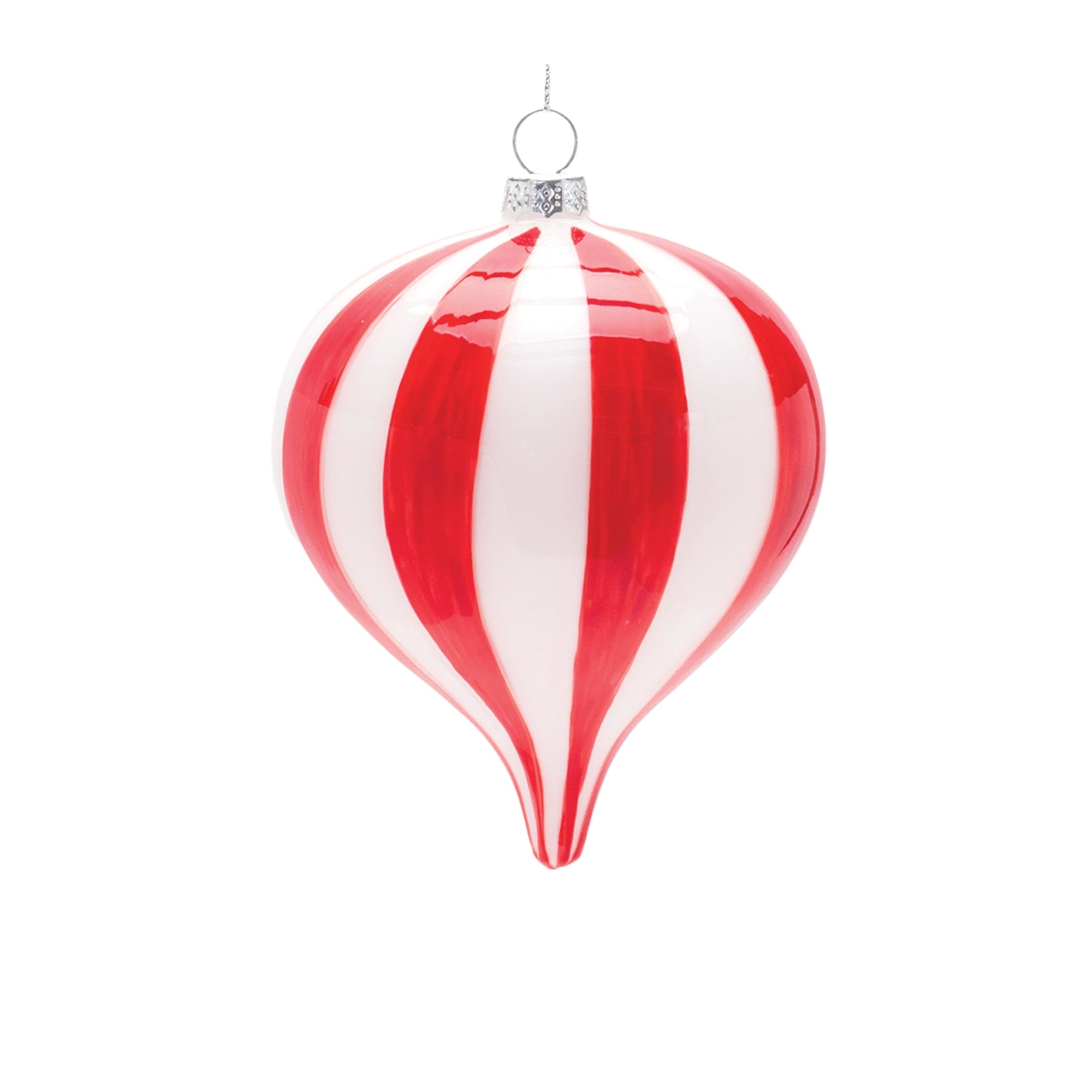 Adorn your Christmas tree and holiday decor with this stunning set of Striped Glass Ornament s. Featuring 6 pieces, the wintry white and festive red tones paired with the striped design is the perfect combination to create a memorable display. The quality glass composition and delicate [silver string hanging accent is sure to endure for seasons to come. Whether you're adding a touch of cheer to your home or gifting to a loved one, these ornaments will definitely bring smiles. , Ornament (Set of 6) 5"H, 5.5"H, 7"H Glass