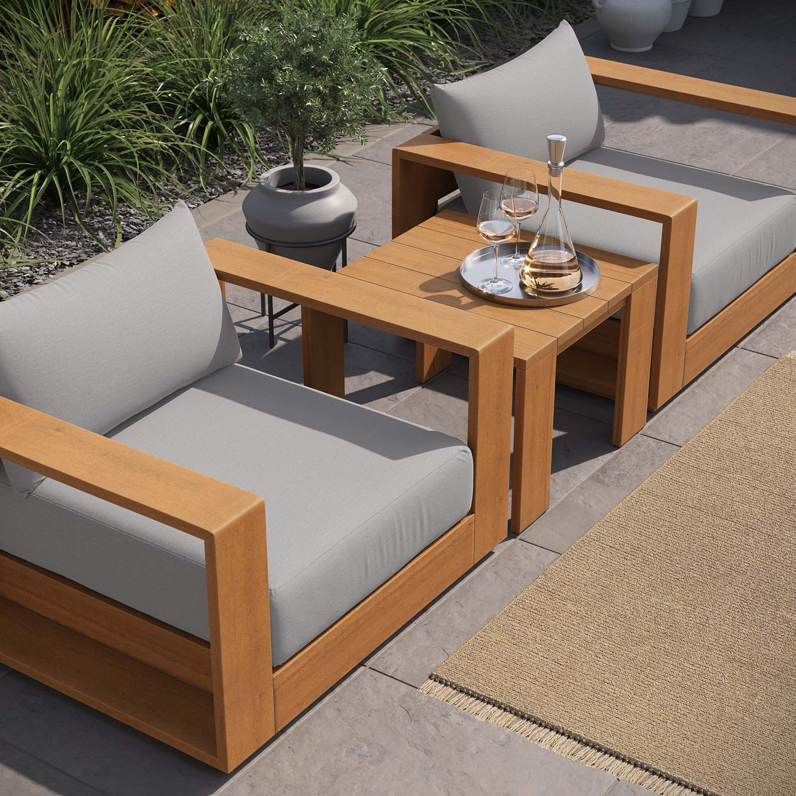 Enliven your alfresco spaces with the Tahoe 3-Piece Outdoor Furniture Set. This modern outdoor patio set is constructed with FSC-certified acacia wood, blending seamlessly into your outdoor lounge spaces. Featuring two lounge chairs and a wood side table, this 3-piece deck furniture set is ideal for poolside lounging or as chic balcony furniture. Dense foam padding on the two lounge chairs ensures sustained comfort, while the UV and water-resistant fabric-covered seats and backrests make it ideal before and after a dip. The removable cushions render this outdoor patio furniture set low maintenance and high performing. Practically designed, the side table works well in the rain thanks to its slatted top that helps keep its surface dry and puddle-free. An accommodating all-weather acacia patio set, Tahoe is perfect for outdoor relaxing and entertaining. This durable 3-piece set features non-marking foot glides to protect your deck or patio floor and comes with easy-to-follow assembly instructions. Set Includes: 2 Lounge Chairs, 1 Side Table. Lounge Chair Weight Capacity: 500 lbs; Side Table Weight Capacity: 198 lbs. Set Includes: One - ACACIA OUTDOOR SIDE TABLE Two - ACACIA OUTDOOR ARM CHAIR