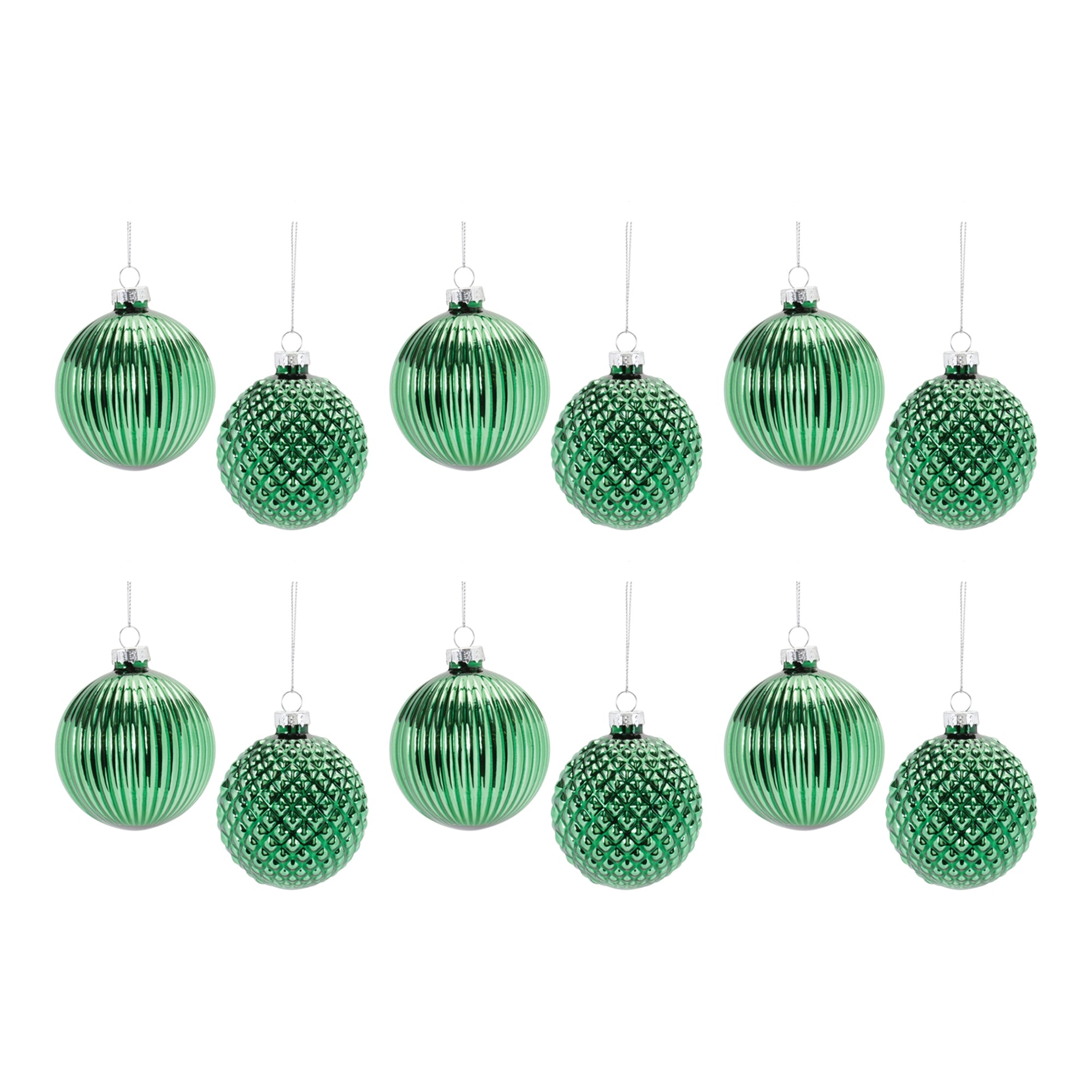 Adorn your Christmas tree and holiday decor with this stunning set of Textured Glass Ball Ornaments. Featuring 12 pieces, the earthy green tones paired with the textured design is the perfect combination to create a memorable display. The quality [material] composition and delicate silverstring hanging accent is sure to endure for seasons to come. Whether you're adding a touch of cheer to your home or gifting to a loved one, these ornaments will definitely bring smiles. , Ball Ornament (Set of 12) 4"D Glass