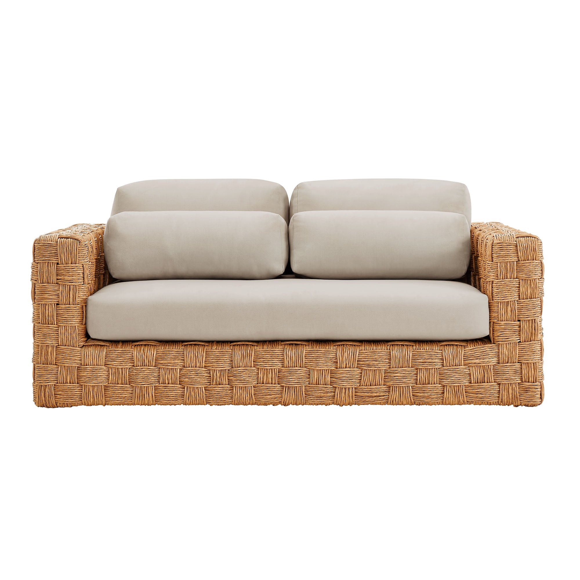 Create a serene outdoor retreat with the Thames Patio Loveseat. Constructed with a sturdy powder-coated aluminum frame and enveloped in premium synthetic woven rattan that boasts a textured, basket-like weave, this wicker sofa brings earthy tones to your outdoor decor. Fitted with upholstered fabric cushions that have rolled edges and two lumbar throw pillows for added comfort, the Thames Outdoor Wicker Loveseat is ideal for relaxation. Its deep seats are perfect for cozy evenings or lazy weekend mornings. Non-marking foot caps protect your outdoor surfaces, allowing you to move and position the rattan loveseat with ease. The entire Thames Outdoor Patio Sofa Collection is UV-resistant and water-repellent, offering comfort that lasts season after season, making it an ideal addition to your patio, deck, or garden. With no assembly required and easy maintenance, this 2 seater outdoor patio couch invites you to unwind in style. Weight Capacity: 800 lbs. One - Thames Outdoor Patio Wicker Rattan Loveseat