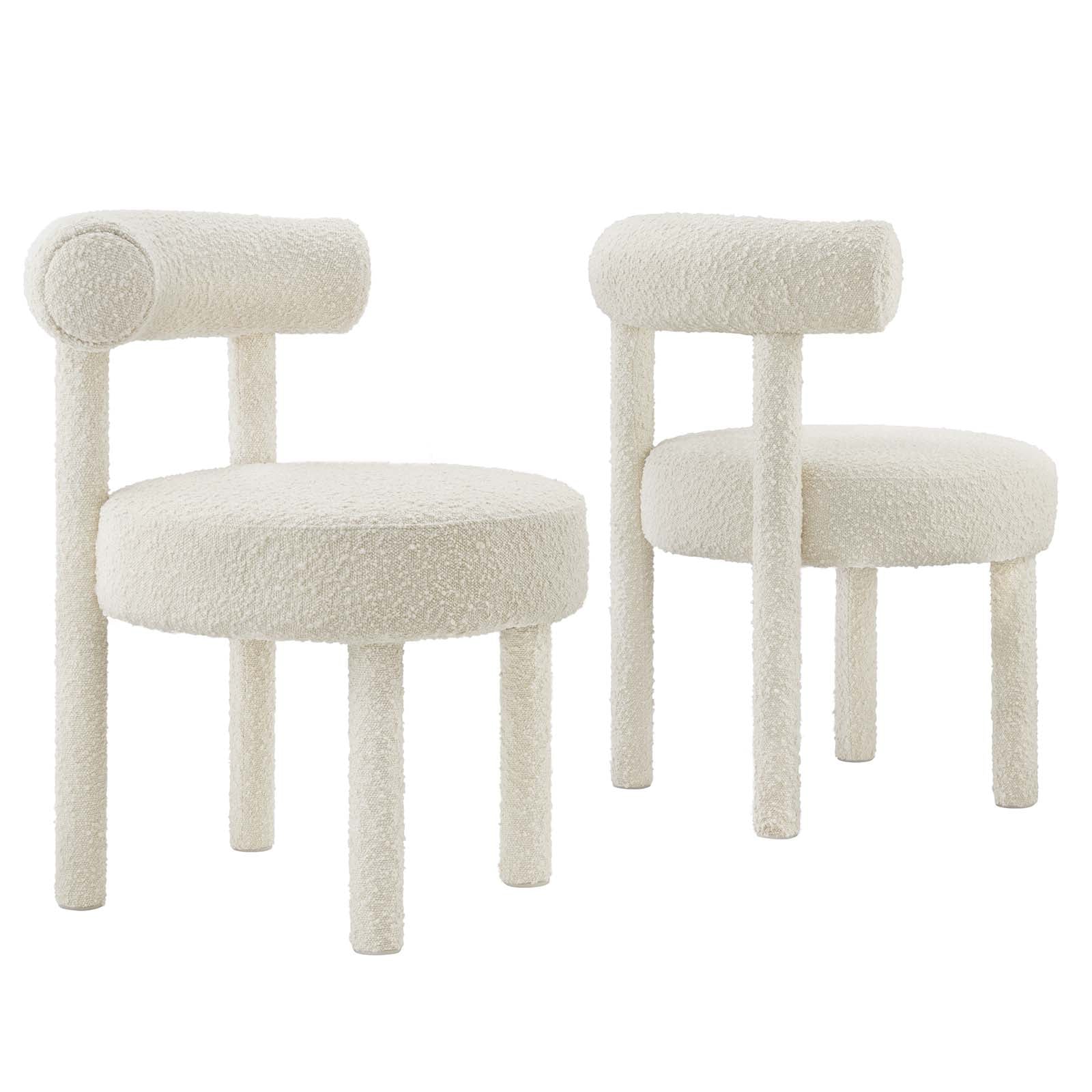 Enhance your space with the exquisite Toulouse Boucle Upholstered Dining Chair Set of 2. This unique set combines dining chair functionality with accent chair elegance. Upholstered in beautifully textured boucle fabric, these dining chairs exude modern luxury and glam deco style. The curved bolster pillow backrests, circular seats, and dense foam padding provide unparalleled comfort and unmatched aesthetics. With non-marking foot pads to protect your flooring, these boucle dining chairs add a touch of sophistication to any room. Weight Limit: 330 lbs. Set Includes: Two - Toulouse Dining chair