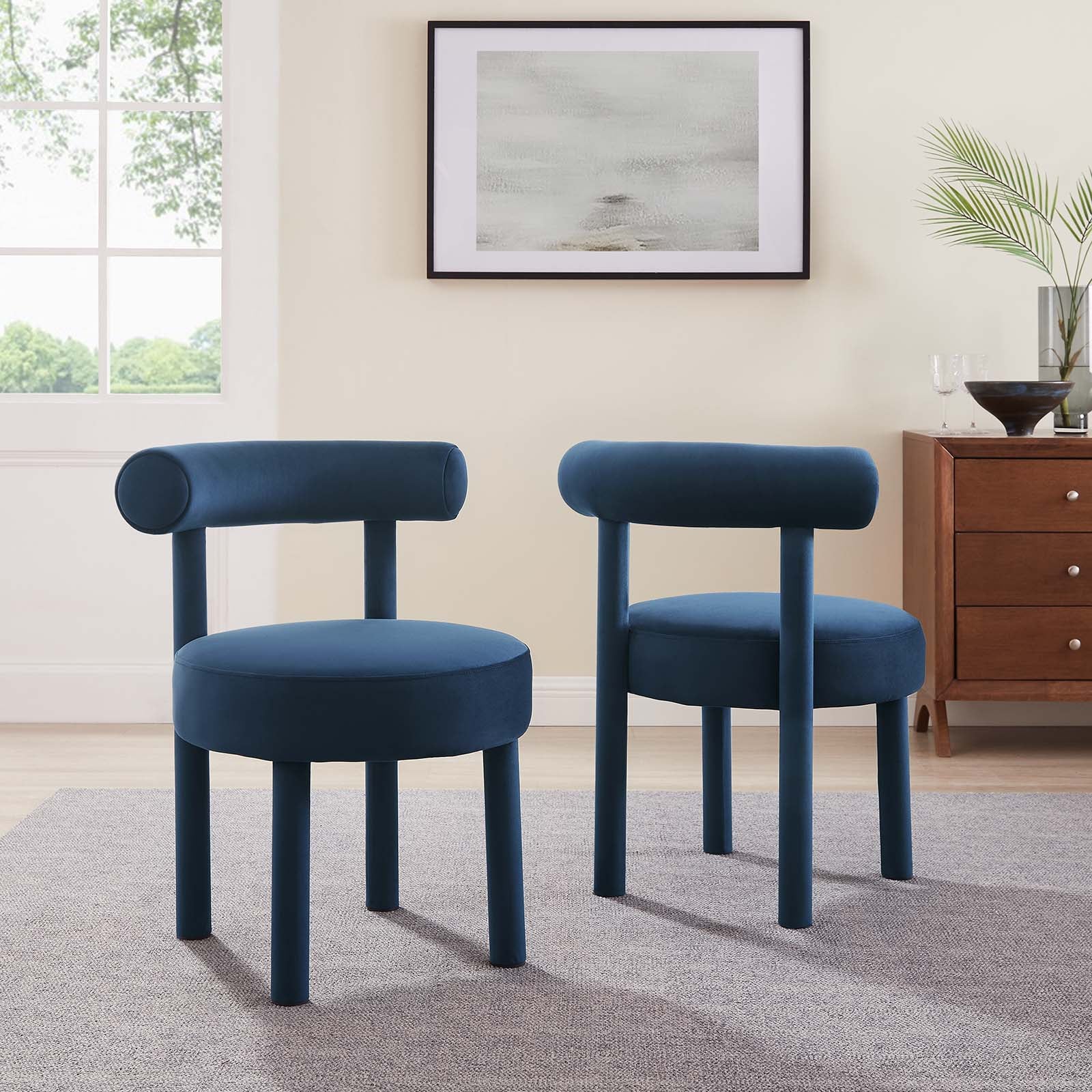 Enhance your space with the exquisite Toulouse Performance Velvet Dining Chair Set of 2 . This unique set combines dining chair functionality with accent chair elegance. Upholstered in stain-resistant performance velvet fabric, these dining chairs exude modern luxury and glam deco style. The curved bolster pillow backrests, circular seats, and dense foam padding provide unparalleled comfort and unmatched aesthetics. With non-marking foot pads to protect your flooring, these boucle dining chairs add a touch of sophistication to any room. Weight Limit: 330 lbs. Set Includes: Two - Toulouse Dining chair