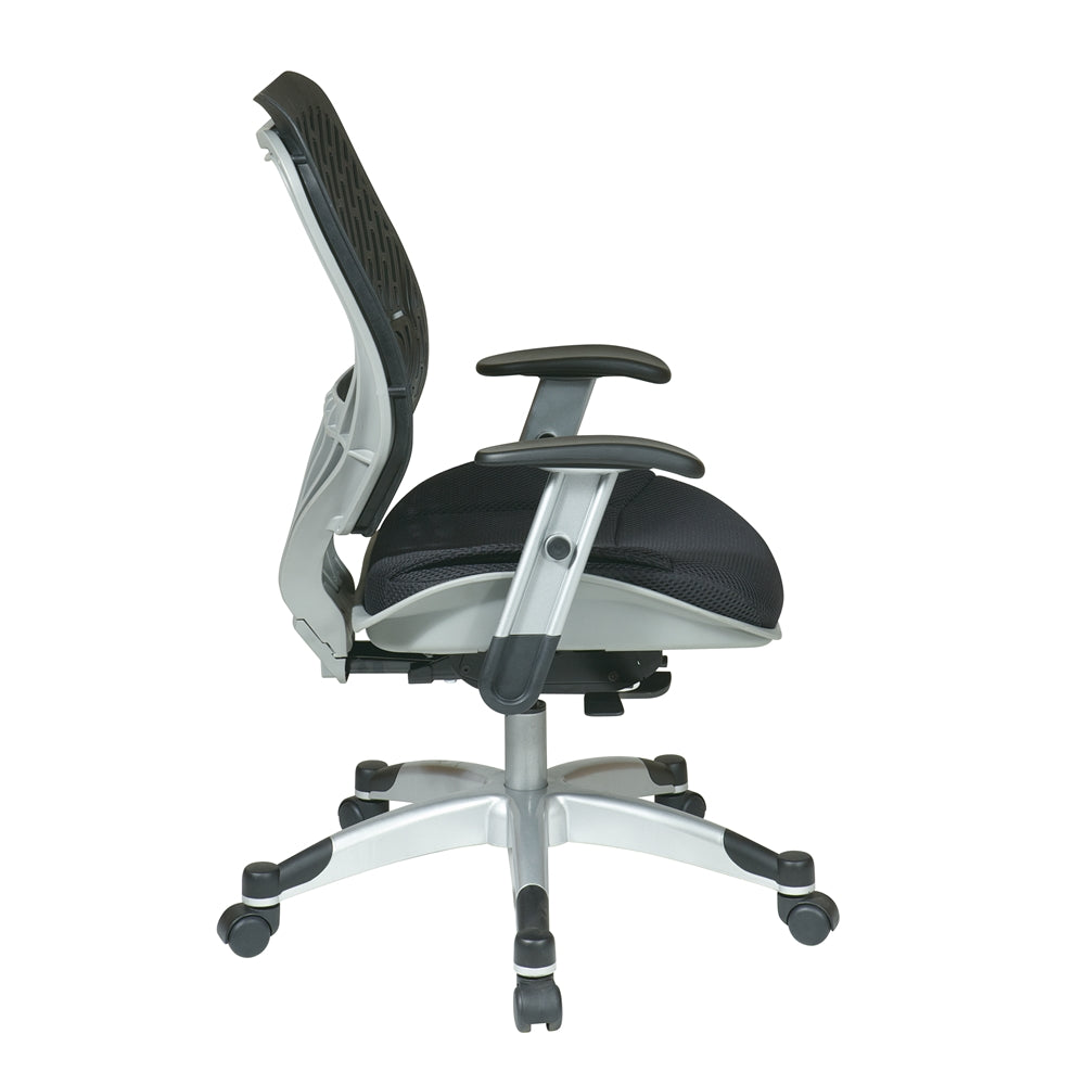 Unique Self Adjusting SpaceFlex¨ Raven Back Managers Chair. Self adjusting SpaceFlex¨ Backrest Support System with Breathable Raven Mesh Seat, One Touch Pneumatic Seat Height Adjustment, Deluxe 2-to-1 Control with 3 Position Lock and Anti-Kick Function, Tilt Tension Adjustment, Height Adjustable Platinum Coated Arms with Soft PU Pads, Heavy Duty Platinum Coated Base with Black End Caps and Dual Wheel Carpet Casters.