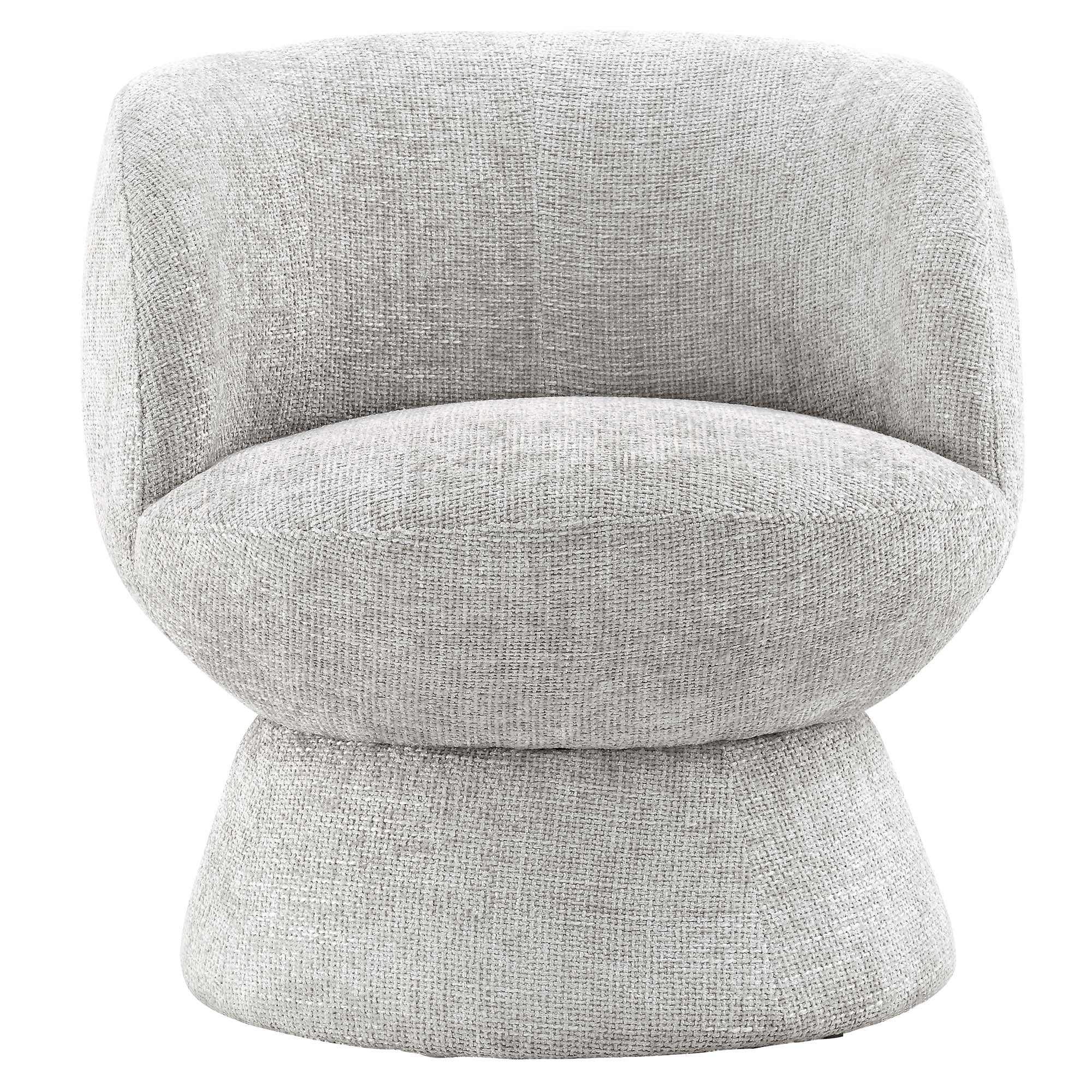 Elevate your living space with the Vesta Swivel Chair, where modern style meets unparalleled comfort. Wrapped in textured chenille fabric, this swivel barrel chair features a unique round silhouette with a distinctive seam up the back, adding a touch of elegance and visual interest. The 360-degree swivel mechanism grants full-range motion, to suit the needs of any moment. Dense foam padding and a sinuous spring support system offer a supportive and comfortable seat, while the sturdy wooden frame offers lasting durability. Resting atop non-marking floor glides, this round swivel chair protects your flooring while providing a stable, cozy seat while relaxing, reading, or conversing. Perfect as a chenille swivel accent chair or a luxe teddy chair, the Vesta Upholstered Armchair blends functionality with a chic design to enhance any decor. Assembly required. Weight Capacity: 330 lbs. One - Vesta Chenille Fabric Swivel Chair