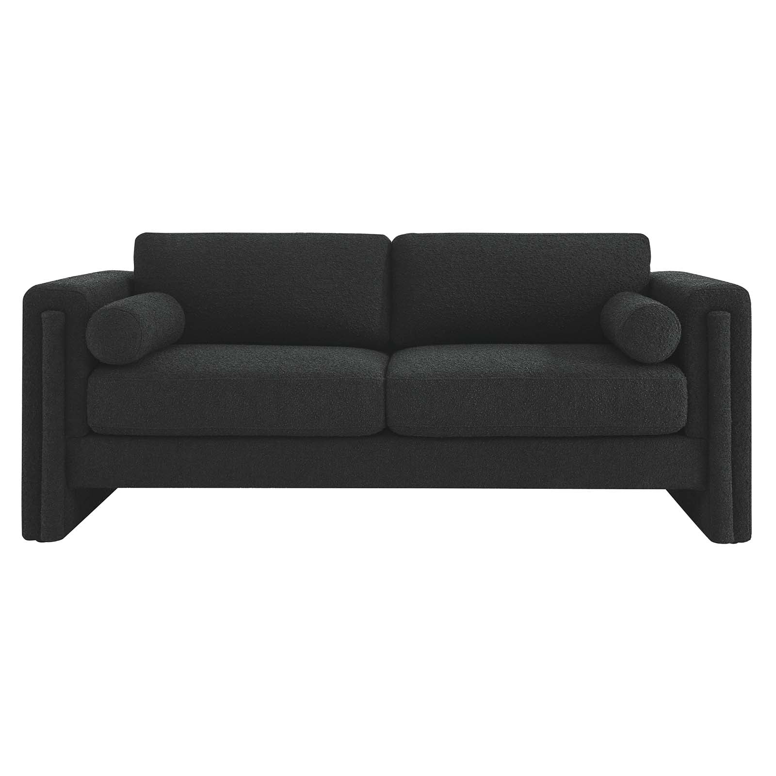 Indulge in the epitome of modern luxury and sophistication with the Visible Boucle Upholstered Sofa. Crafted with a sturdy wood and plywood frame, this sofa exudes modern elegance with its sleek lines, tailored silhouette, and complementing bolster pillows. The adjustable non-marking foot pads protect your flooring while providing sturdy stability. Sink into cozy comfort with the dense foam padding, individualized pocket spring support, and soft, durable boucle fabric upholstery with a charming nubby texture on this three-seater sofa. The cushions and cushion covers are zippered and removable. Enjoy unmatched support with the pocket coil springs that offer a premium seating experience. Assembly is required with easy to follow assembly instructions. Weight Capacity: 990 lbs. Set Includes: One - Sofa