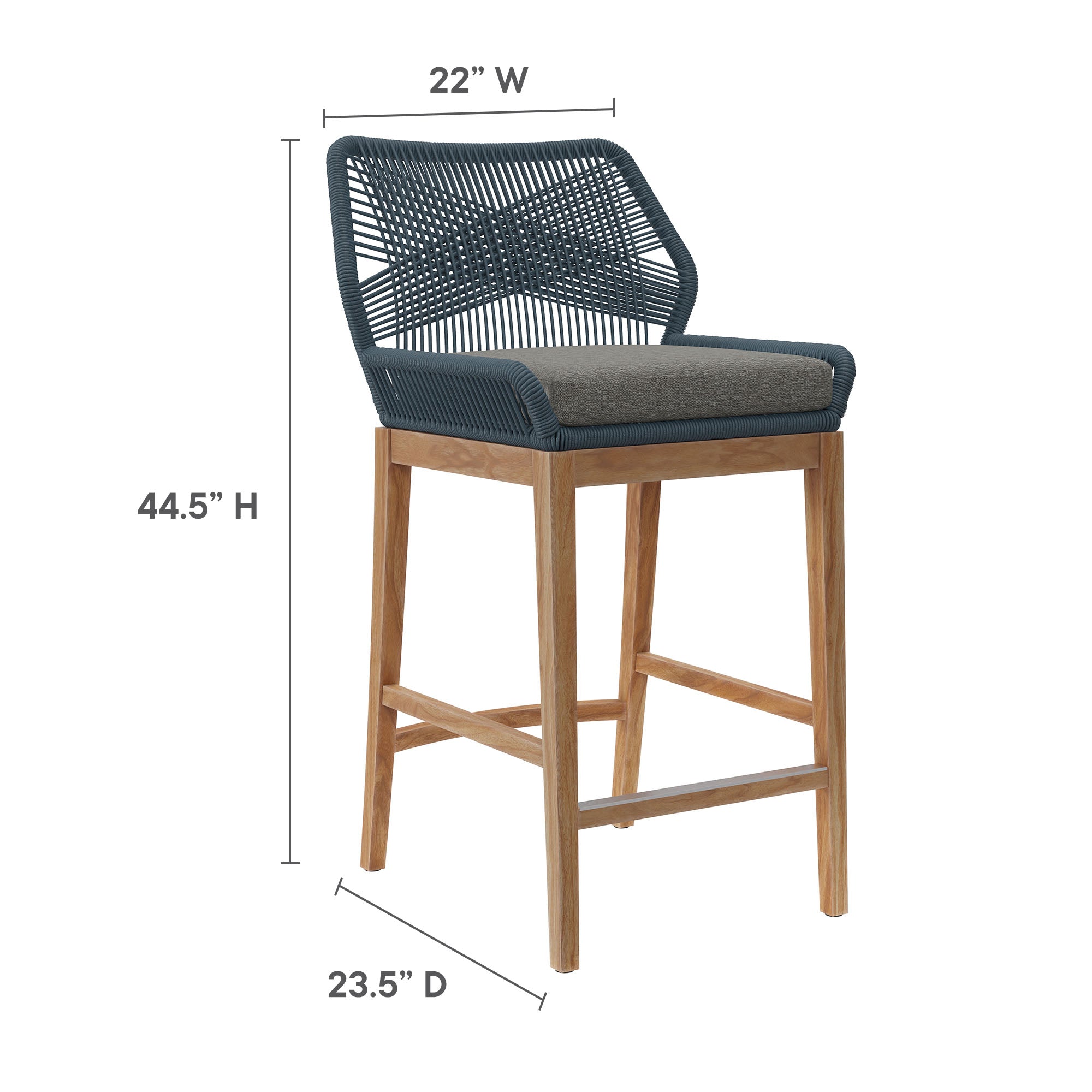 Enjoy the company of family and friends or a peaceful morning around the Wellspring 3-Piece Outdoor Bar Set. Crafted from premium, weather-resistant solid teak, this patio dining set includes a 36" round high-top bar table with a slatted surface and two matching bar-height stools. Both the tall bistro table and stools feature sturdy teak wood bases with non-marking foot caps to protect outdoor flooring, while the tableÕs cross supports enhance stability. The modern bar stools are designed with aluminum seats, woven rope backs, and thick foam-padded cushions for lasting comfort. The cushions include ties for a secure fit and can be easily removed for cleaning. Whether placed on your porch, patio, or in the backyard, this outdoor dining set brings a warm, inviting ambiance, creating the perfect spot for two to enjoy drinks or meals al fresco. Assembly required. Two - Wellspring Bar Stools One - Wellspring Bar-Height Table