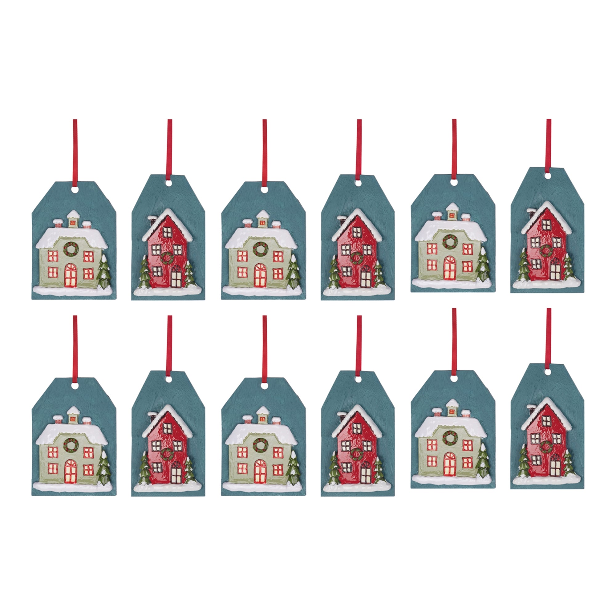 Get into the holiday spirit with this set of Winter House Tag Ornaments! Whether you're adding a touch of cheer to your tree or gifting to a loved one, these ornaments will definitely bring smiles to your home. With bright blue and red tones, snowy house design, and a quality polyresin construction, these joyful decorations are sure to last for years to come! Add a little something special this holiday season with this memorable set of ornaments., Tag Ornament (Set of 6) 5"H, 5.5"H Resin