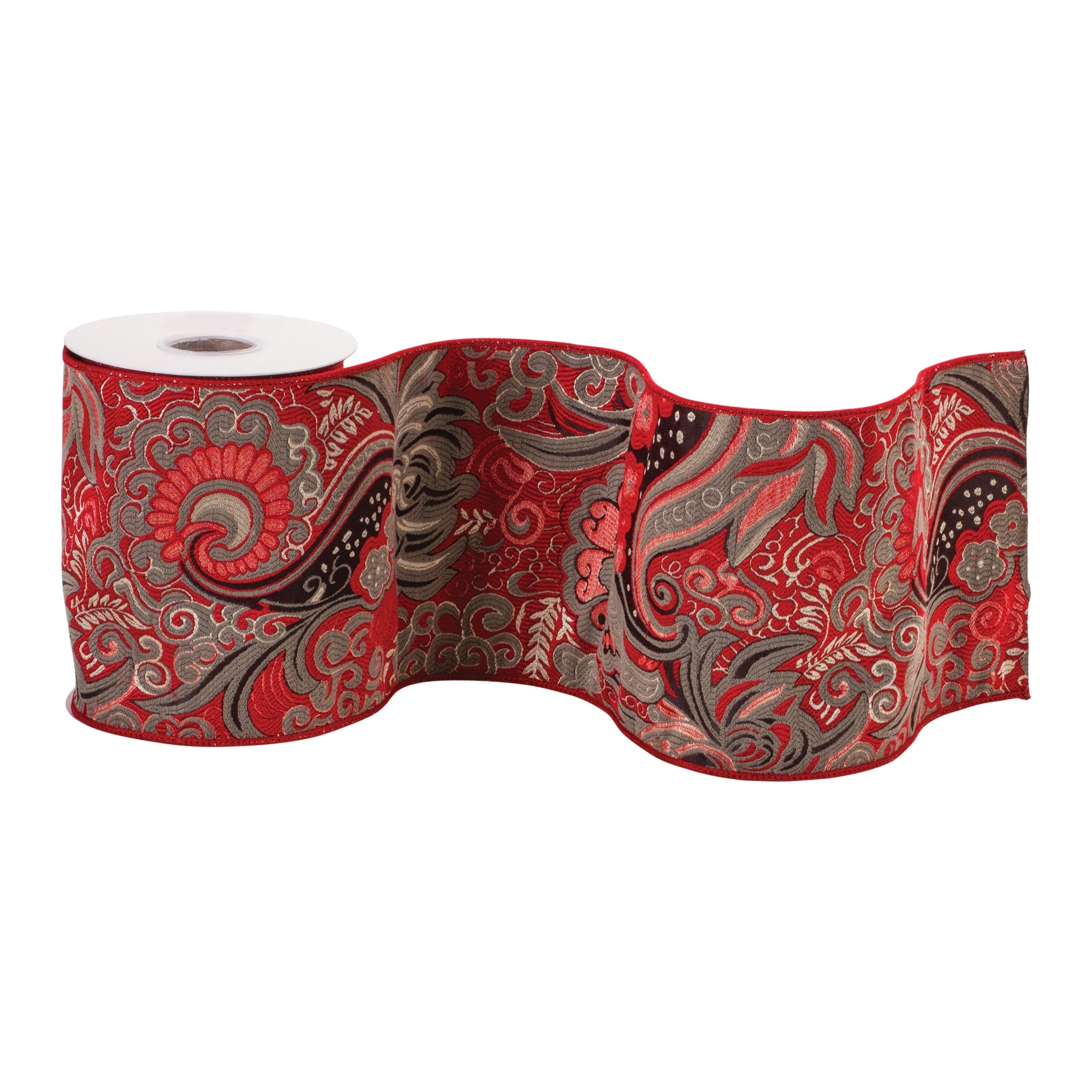 Embellish your home decor items, gift wrap, craft projects, and more with this beautiful Wired Holiday Ribbon. Measuring 6"x5 yards in length, the roll of ribbon features a paisley design. The classic red and gold tones paired with quality polyester and iron wire composition is the perfect combintion to create a stunning holiday display. Use this ribbon to make hand-tied bows to adorn onto your Christmas presents or holiday wreaths, or embellish your Christmas tree with a trailing ribbon garland., 6" x 5 Yds. Ribbon Wired Polyester
