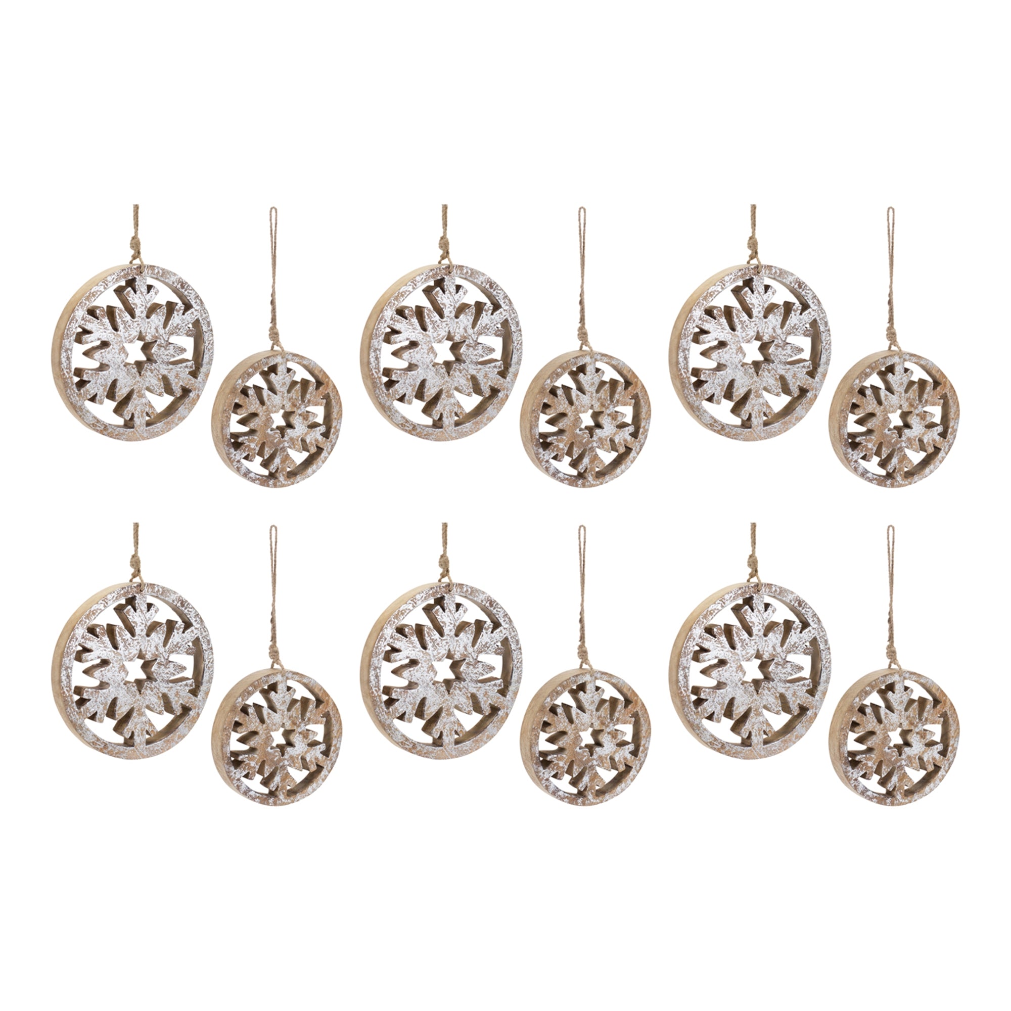 Add a rustic touch to your Christmas Tree with this beautiful set of Star and Wood Cut Out Snowflake Ornaments. Featuring 12 pieces, this set's earthy brown tones, cut-out snowflake design, and distressed finish are the perfect combination to create a memorable display. The quality wood composition with jute string hanger is sure to endure for seasons to come. Whether you're adding a touch of cheer to your home or gifting to a loved one, these ornaments will definitely bring smiles to your home. , Snowflake Ornament (Set of 12) 6"H, 8"H Wood
