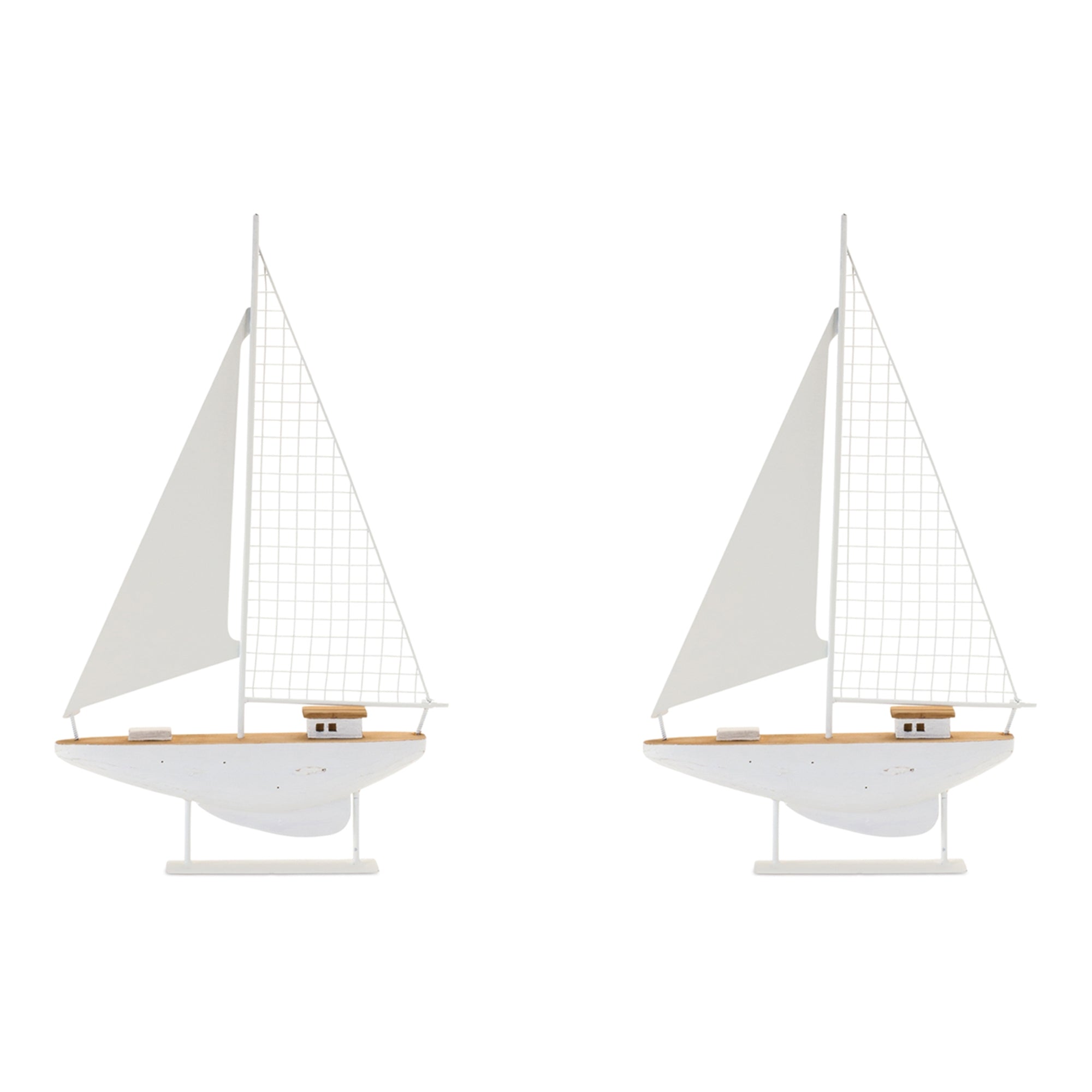 Transform your living space with a classic, timeless touch. This set of Wood Sailboat Sculptures are the perfect way to bring nautical charm and coastal vibes into your life. Crafted with bright white finish and natural wood accents, this beautiful sculpture stands out against any backdrop. Constructed from fir wood with a metal sail for durability, this traditional sailboat design will make a stunning addition to your beach house or lakeside cabin., Sailboat (Set of 2) 11"L x 18.25"H Metal/Wood