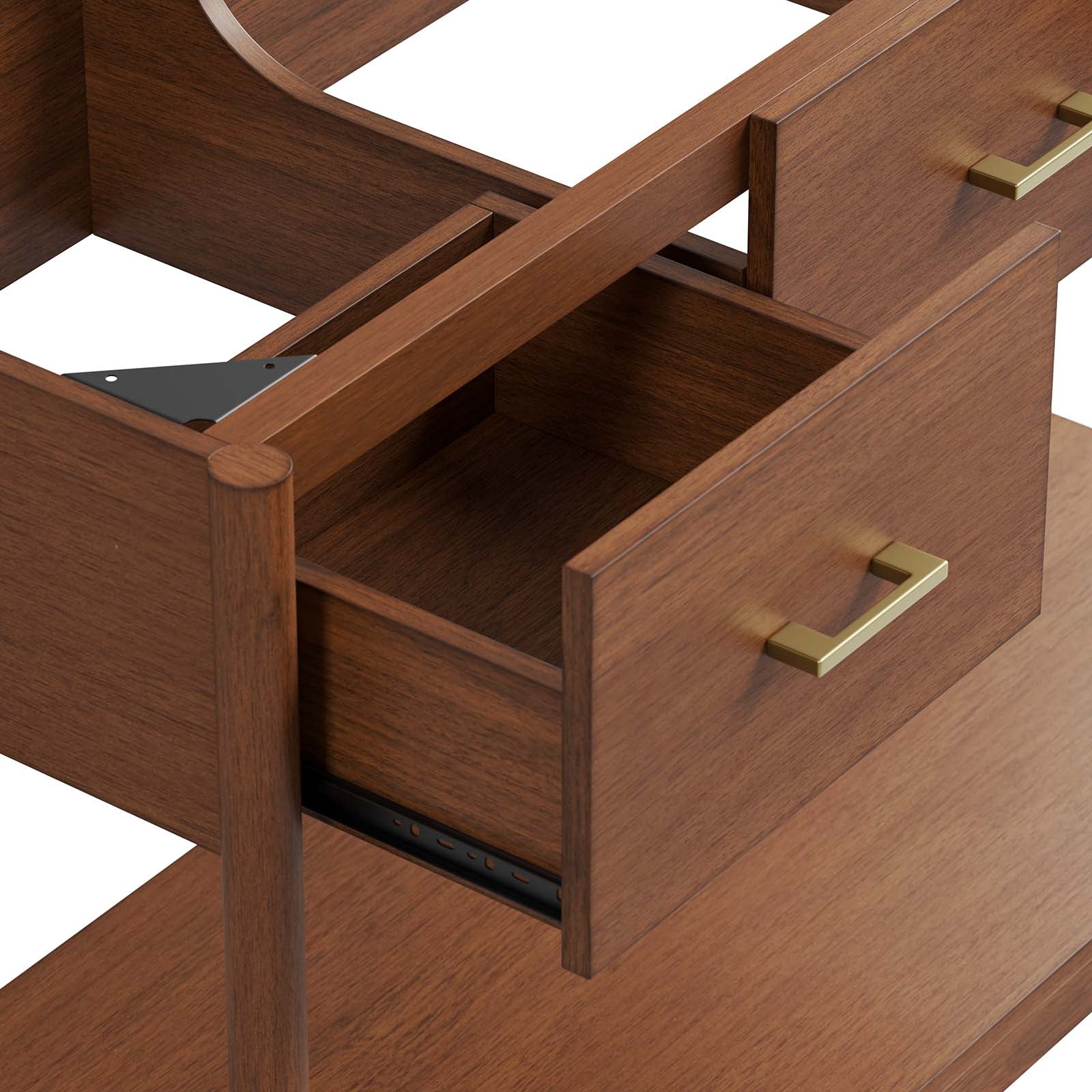 - Bullets: MDF and Rubberwood Wood Grain Veneer Two Spacious Side Drawers Metal Handle Pulls Tapered Legs Sink Basin and Fixtures Not Included Assembly Required
